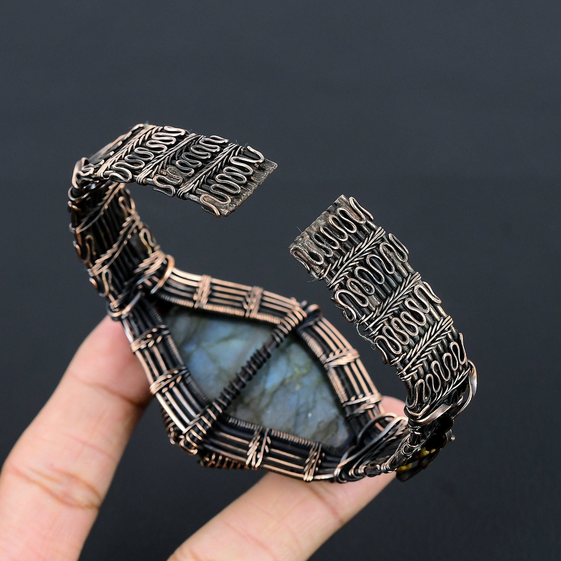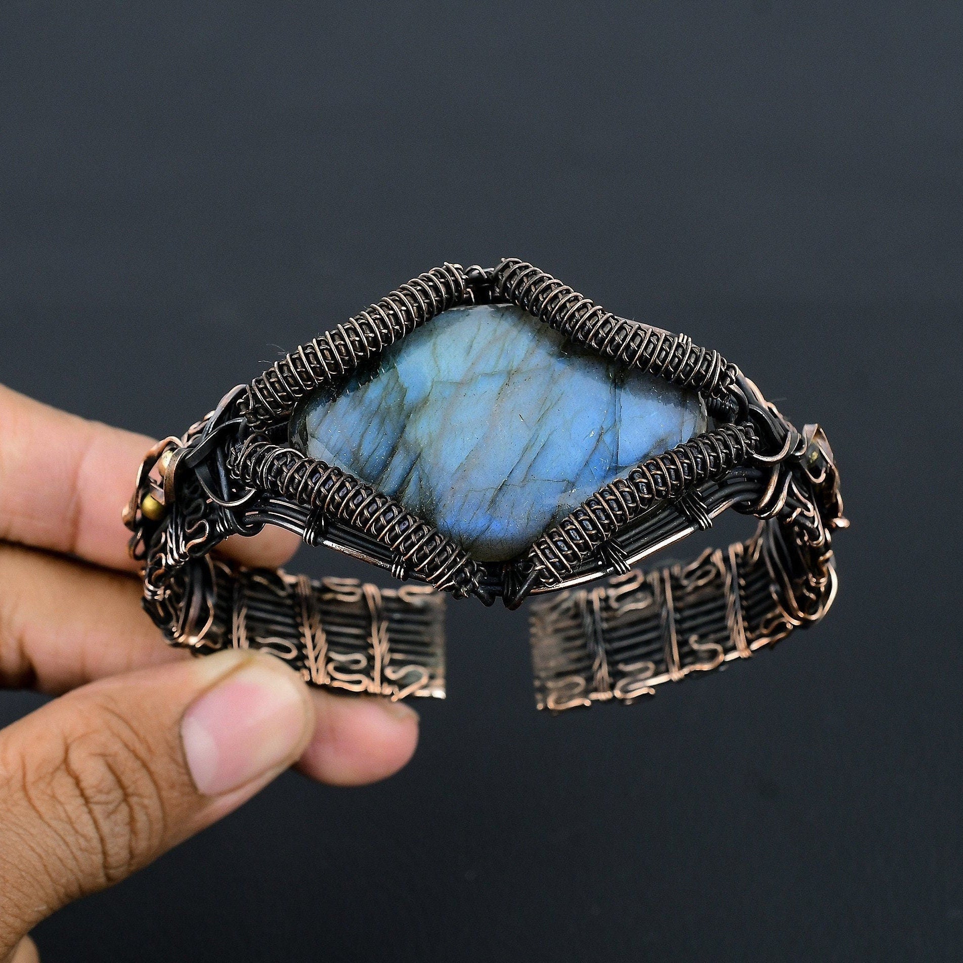 Embrace the mystical allure of this stunning wire-wrapped bracelet, featuring a captivating labradorite gemstone. Each piece is meticulously handcrafted, ensuring that no two designs are exactly alike.