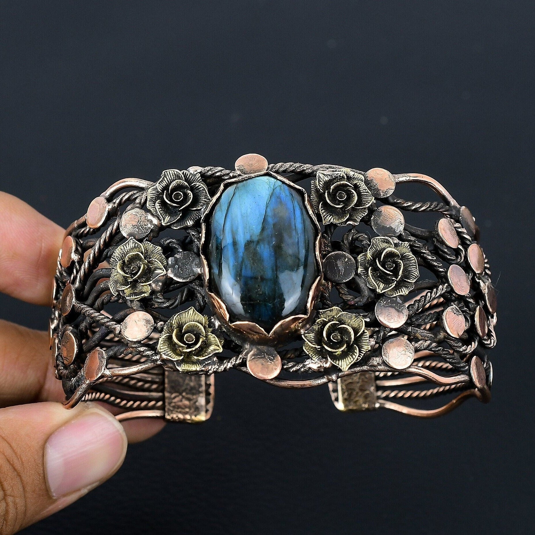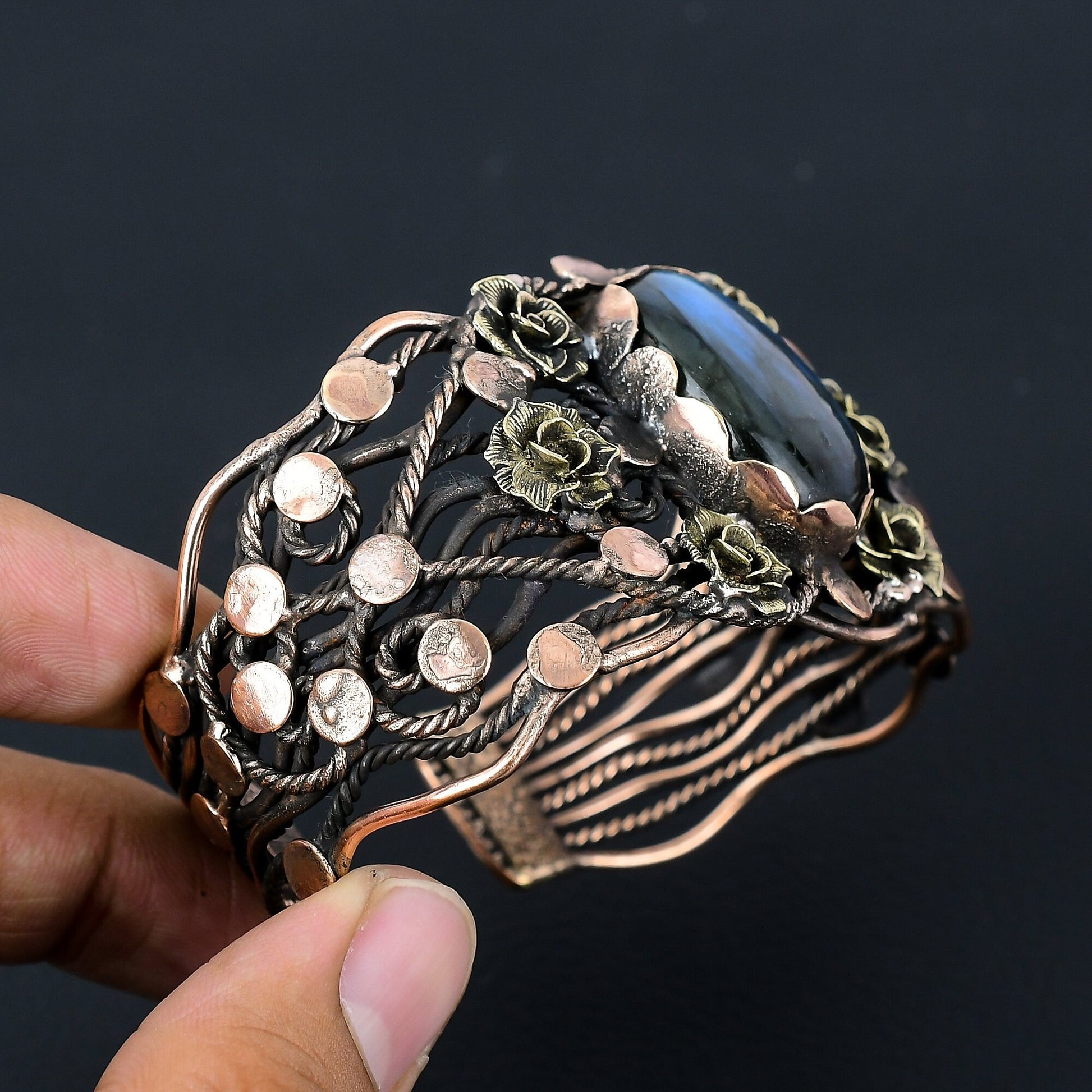 Introducing our exquisite Handcrafted Floral Labradorite Cuff Bracelet, a true masterpiece that captures the essence of nature's beauty.