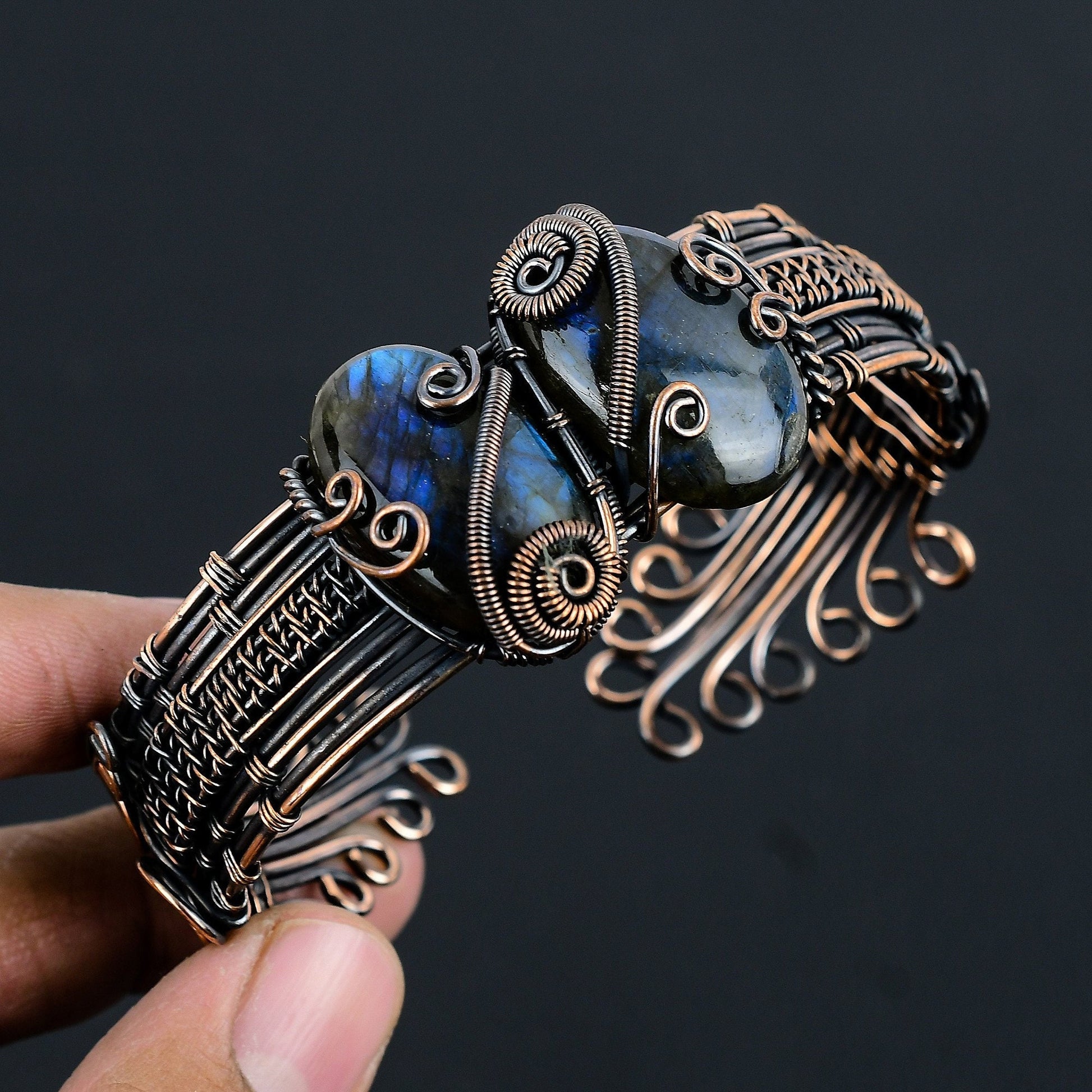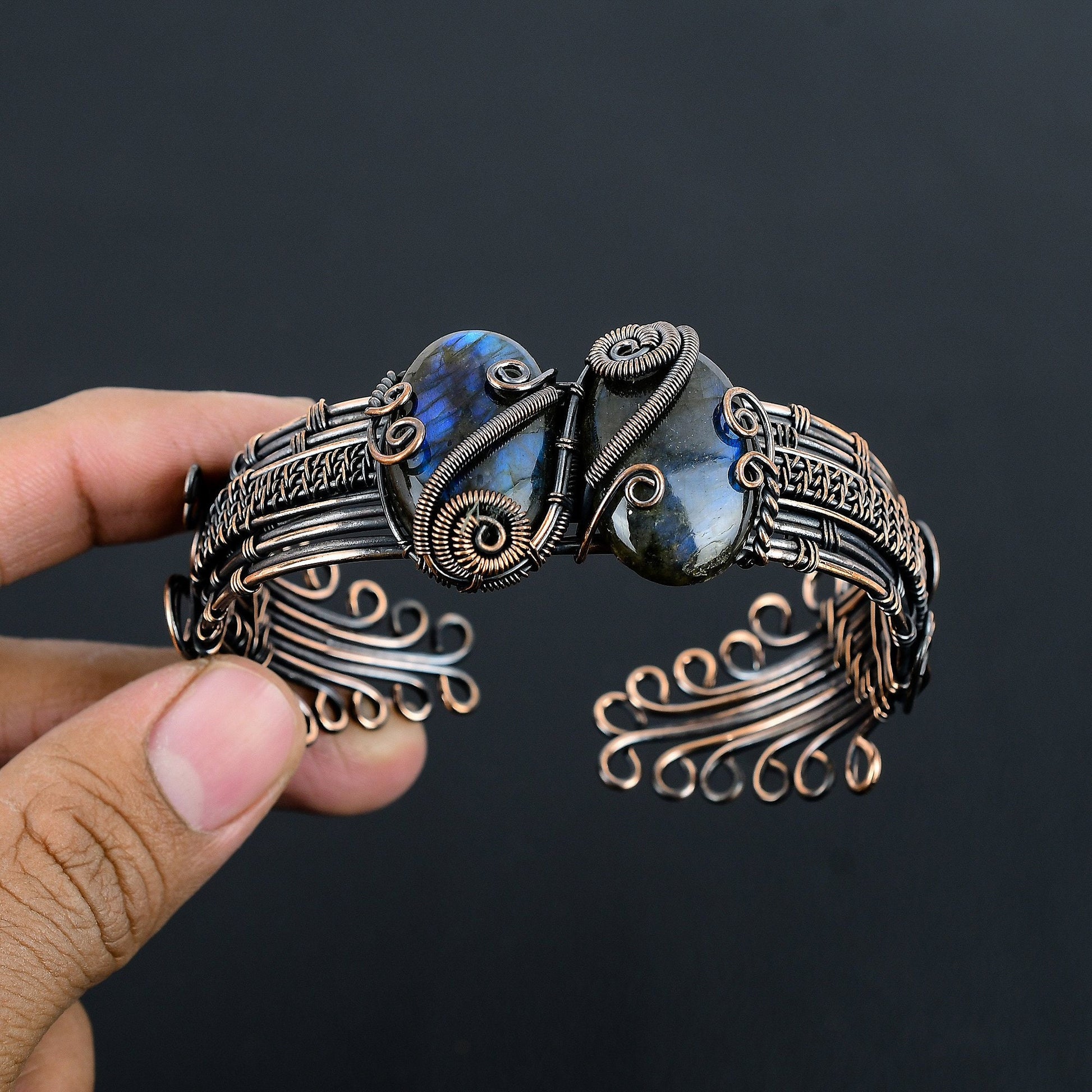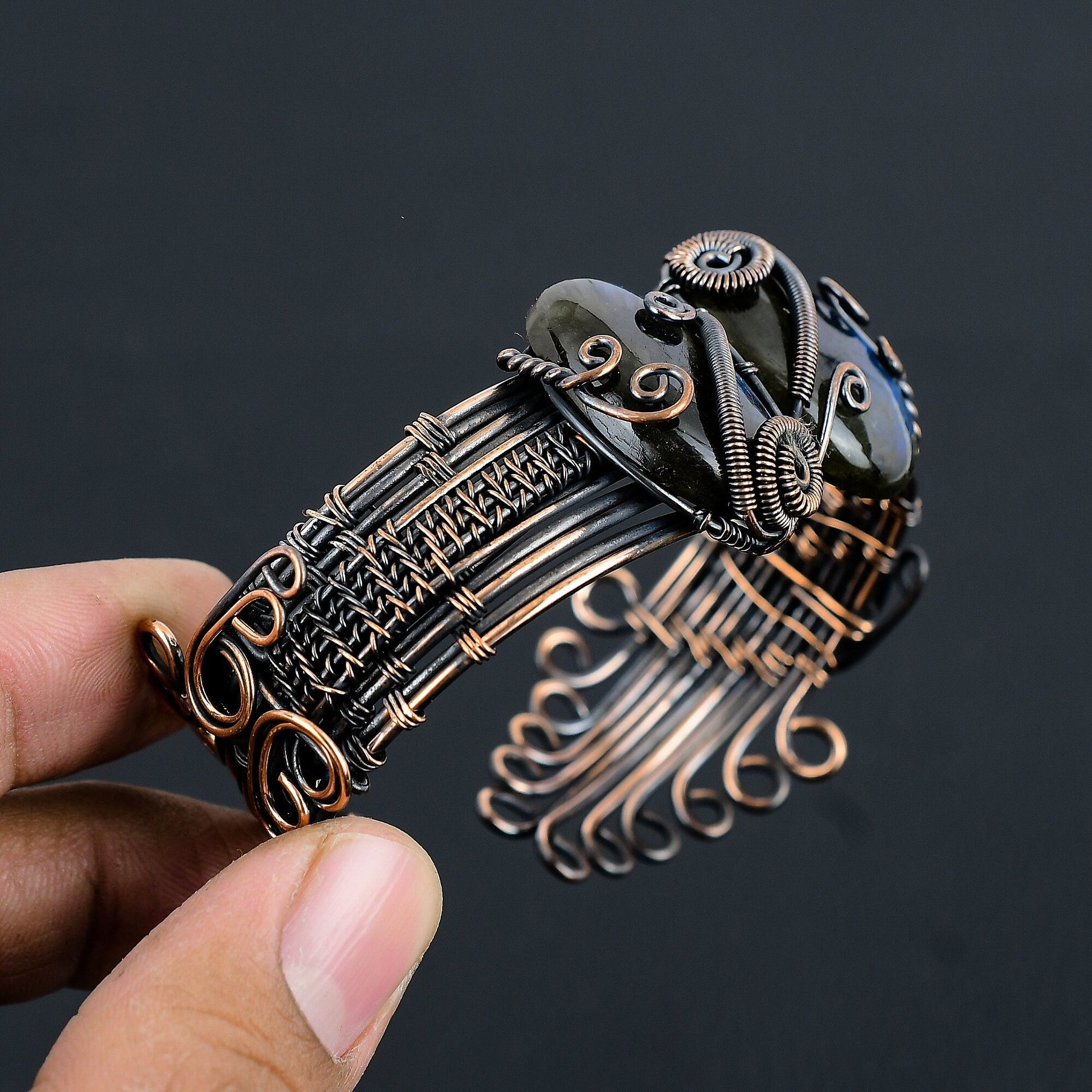 - Handcrafted design complemented by polished labradorite stones.