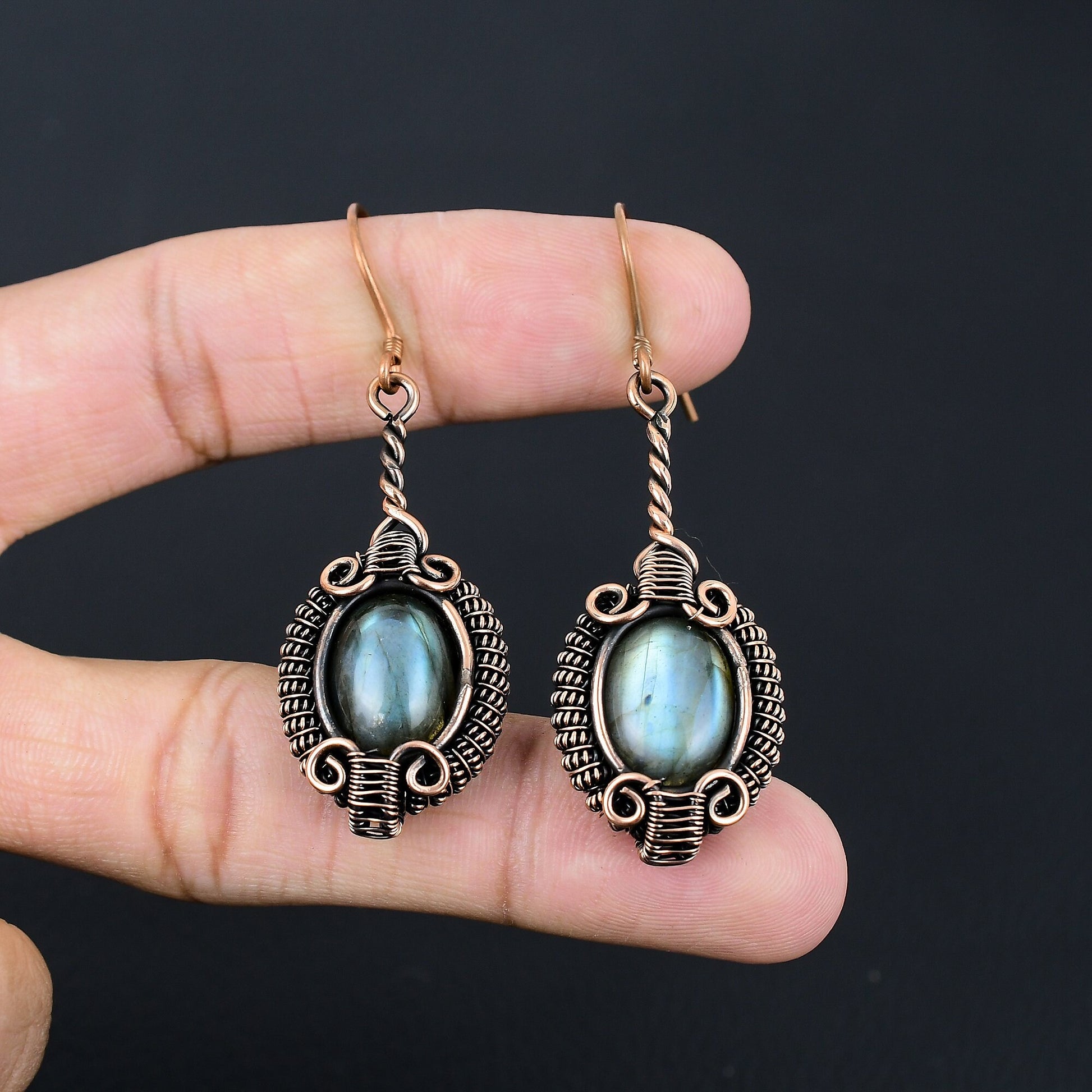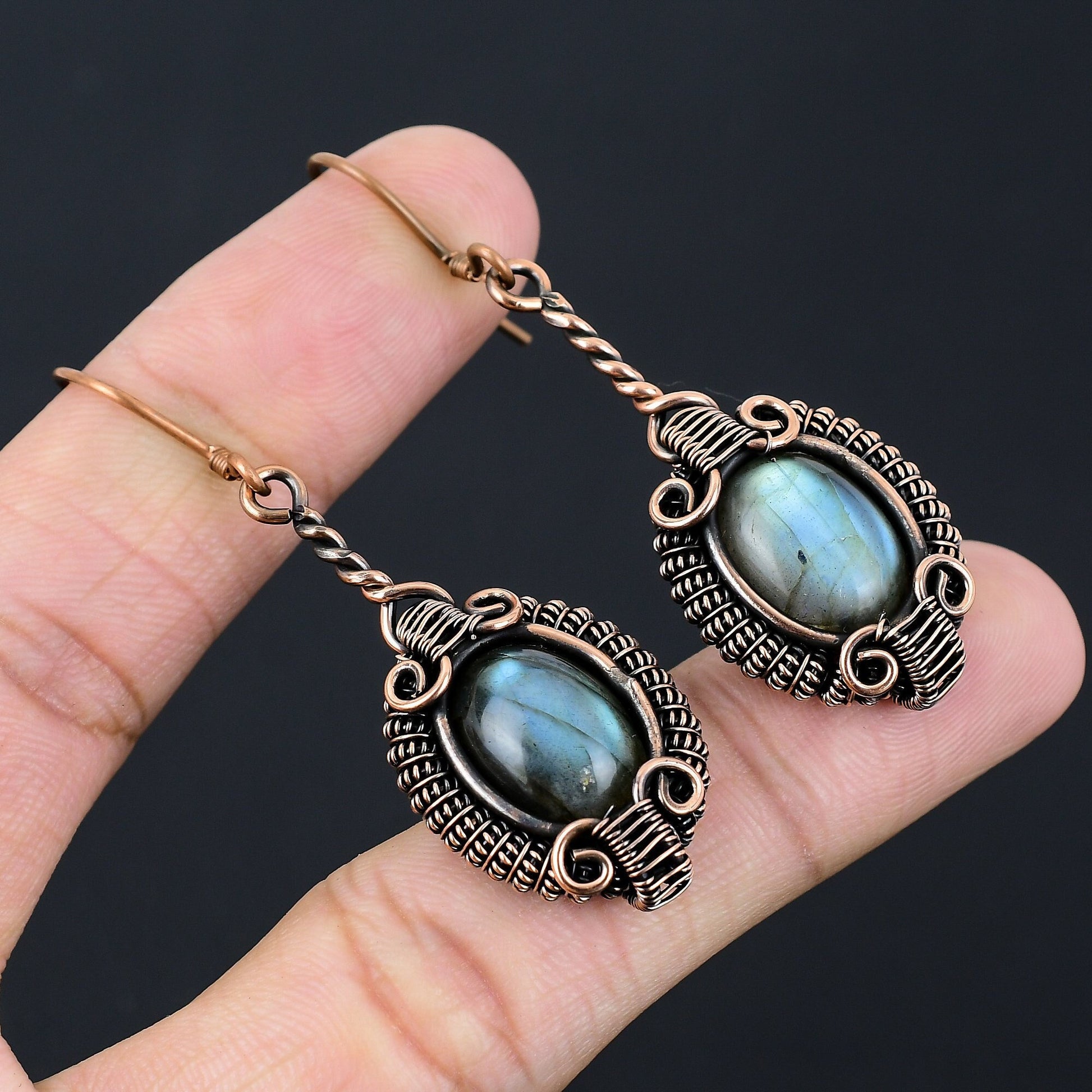 Discover the enchanting allure of our handcrafted Labradorite Dangle Earrings. Each earring features a stunning labradorite stone, renowned for its captivating play of colors, elegantly wrapped in intricate copper wirework.