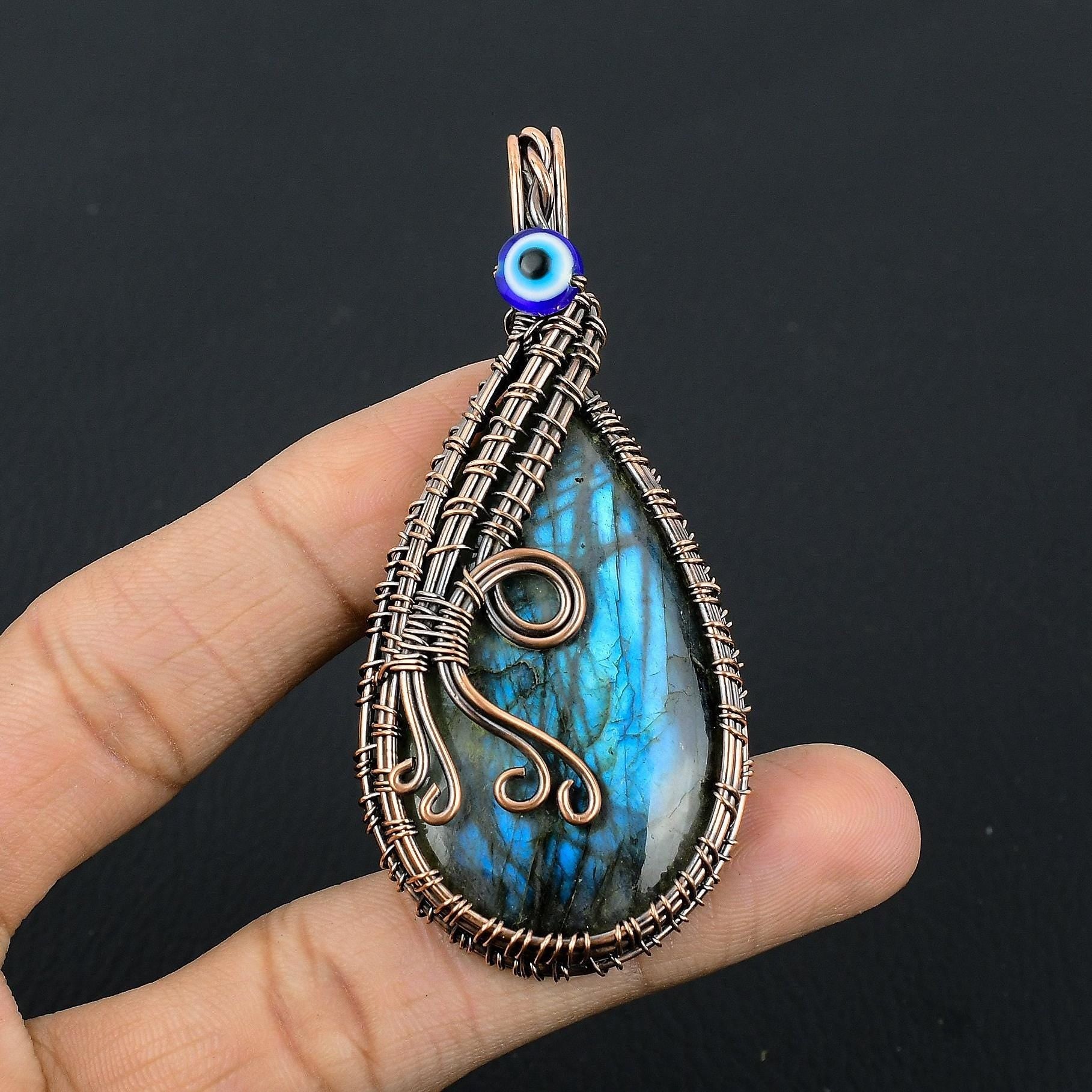 🌟 Design: Handcrafted with intricate copper wire wrapping, this teardrop-shaped pendant showcases the iridescent beauty of natural labradorite.