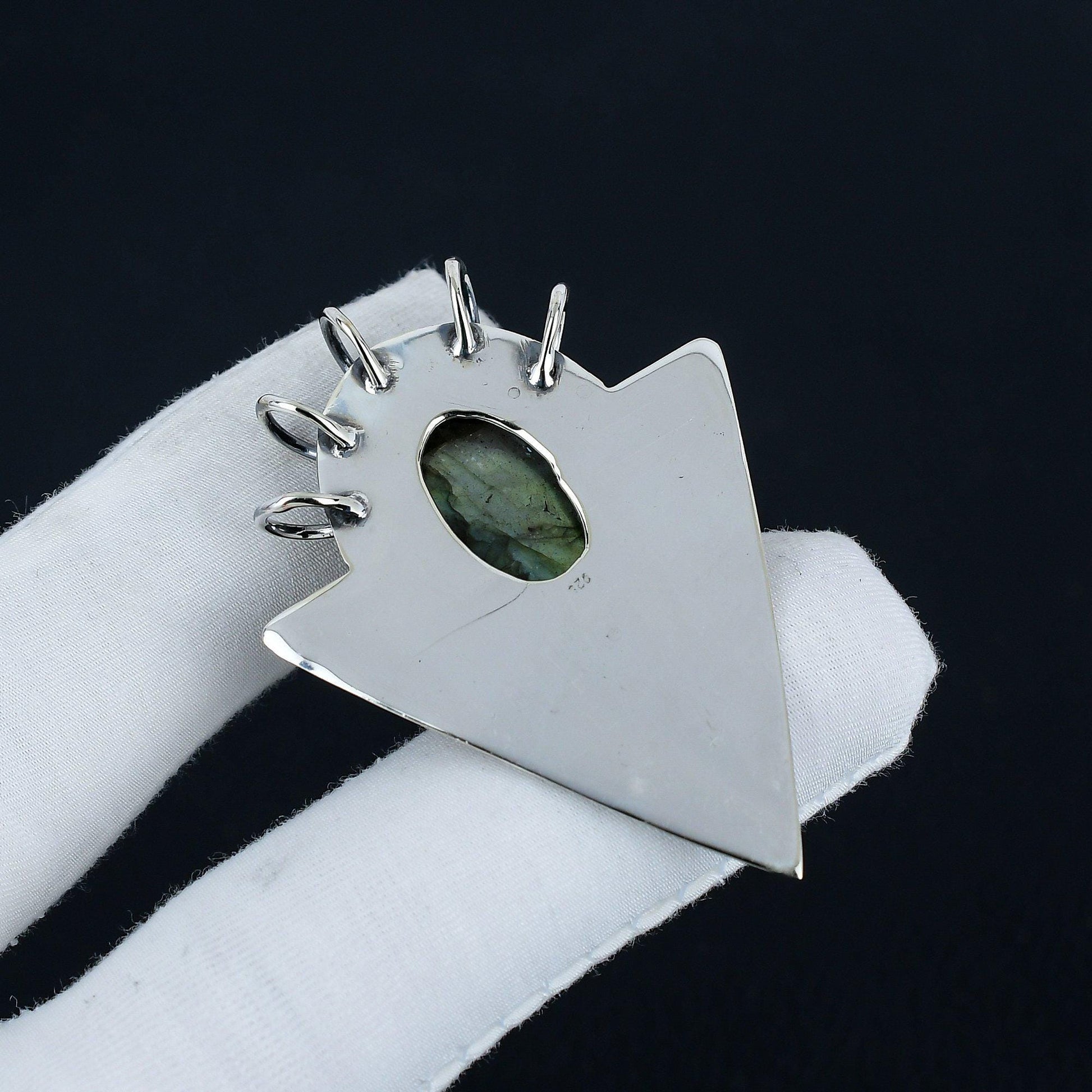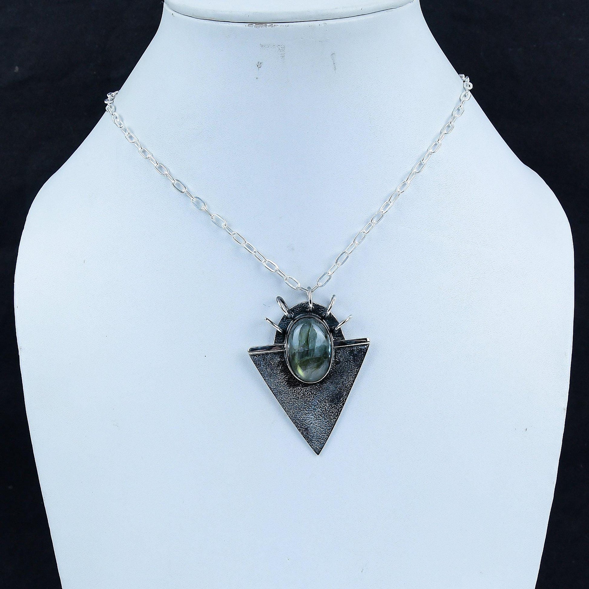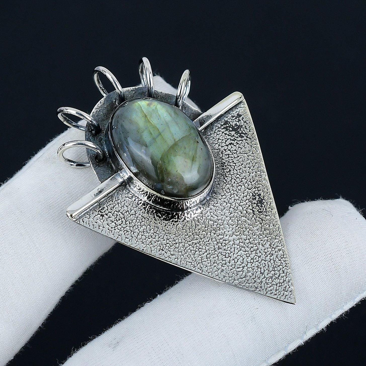 Elevate your style with this exquisite handcrafted pendant, featuring a striking labradorite stone set in textured sterling silver.