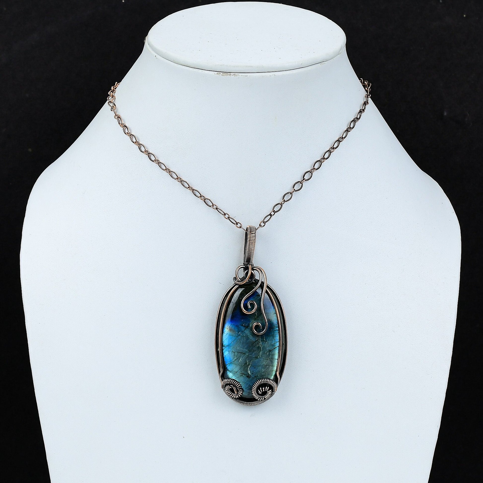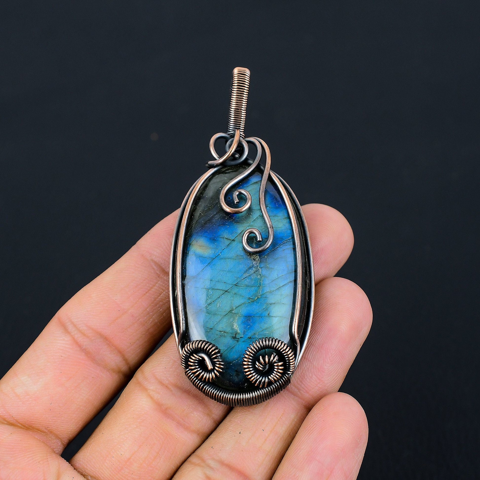 Experience the mesmerizing allure of our handcrafted Labradorite pendant. Each stone is encased in a stunning copper wire wrap, enhancing its unique, natural iridescence.
