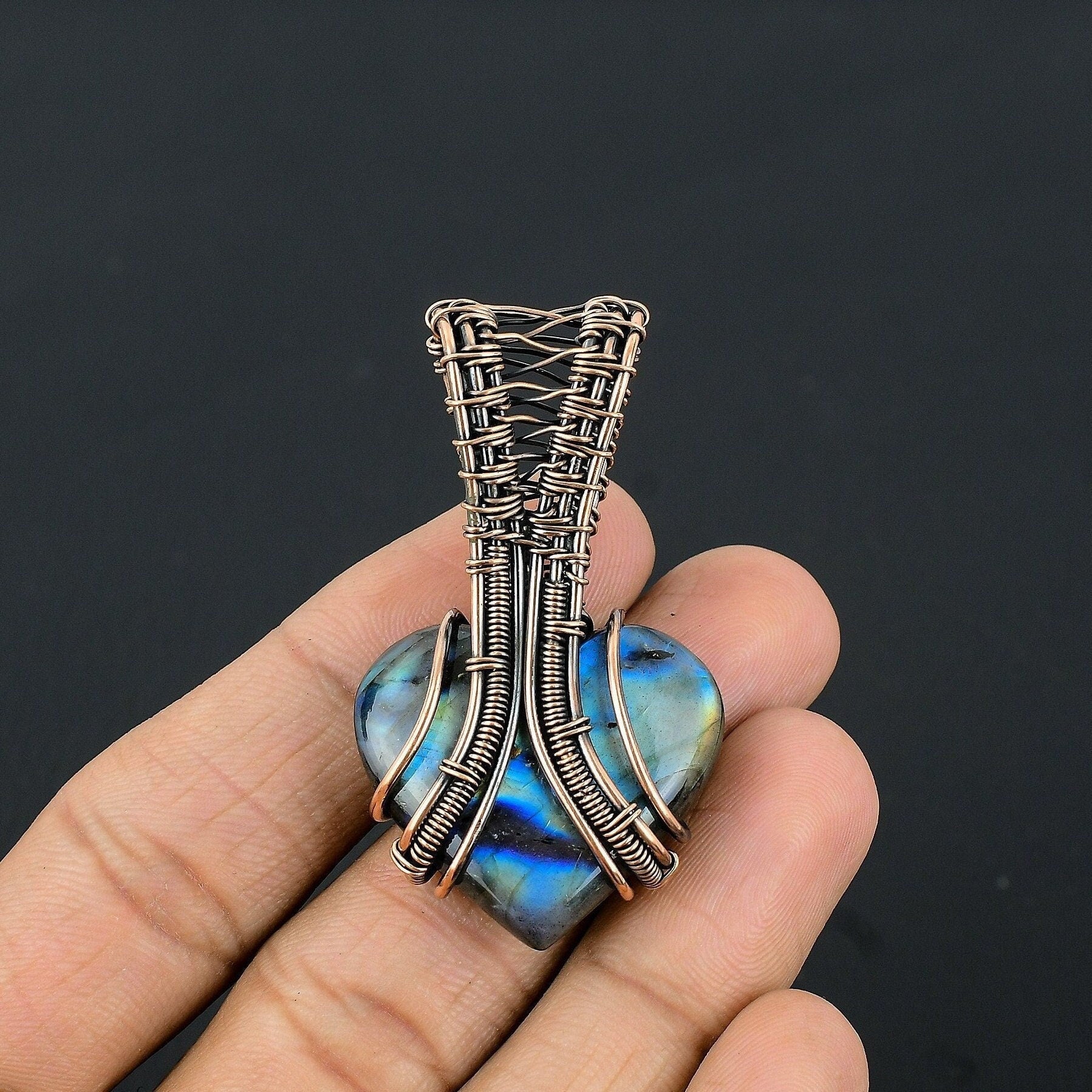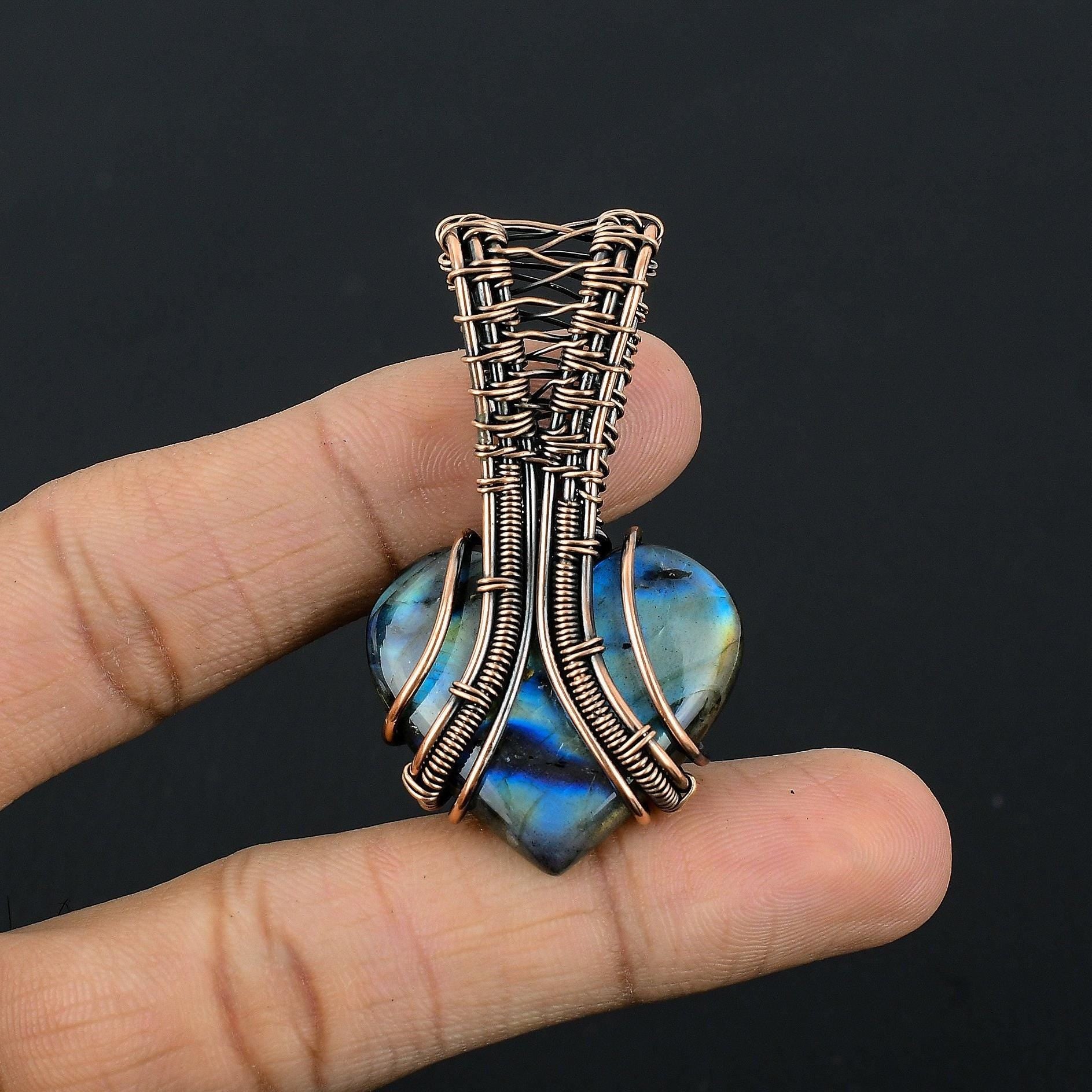 Experience the timeless elegance of our handcrafted copper wire-wrapped pendant, exquisitely designed to showcase a beautiful heart-shaped labradorite gemstone.