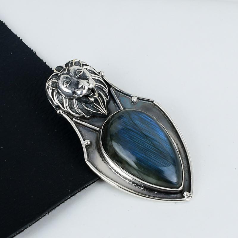 A stunning labradorite gemstone enhances the pendant's elegance with its mesmerizing play of colors.