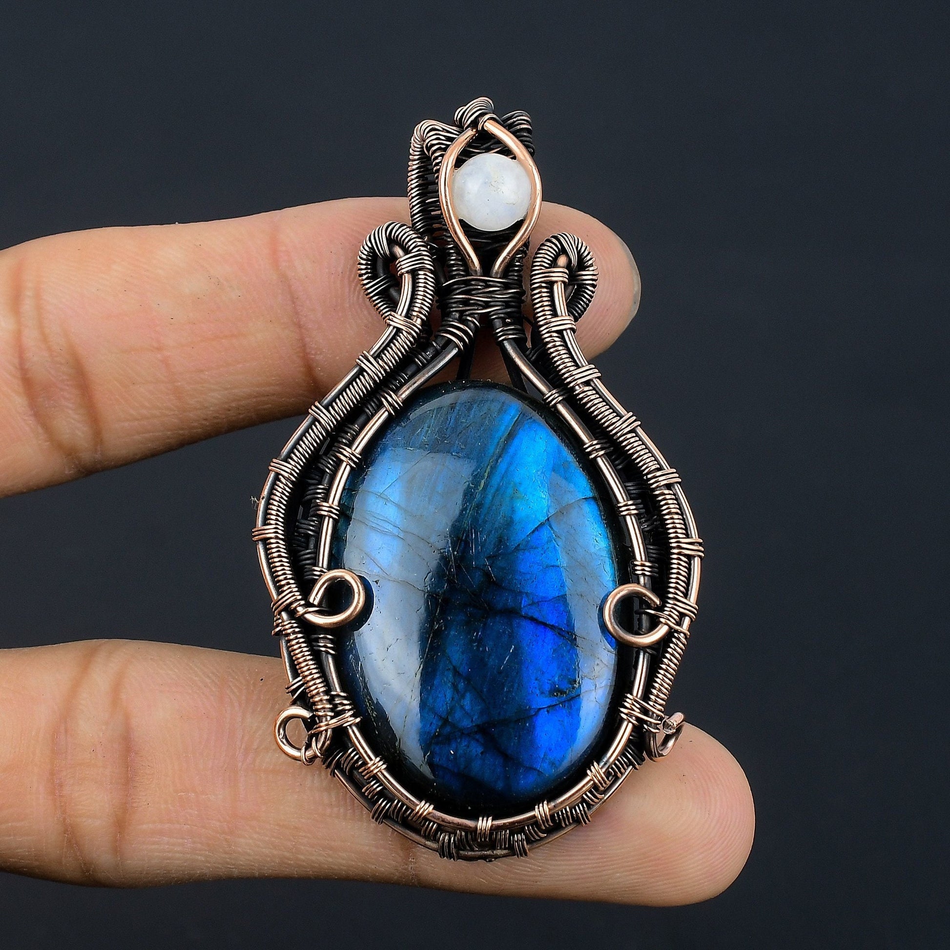Experience the allure of mystical elegance with our handcrafted pendant, featuring a stunning Labradorite gemstone, renowned for its captivating play of colors. Exquisitely wrapped in intricate wire detailing, this piece combines timeless craftsmanship with modern design.