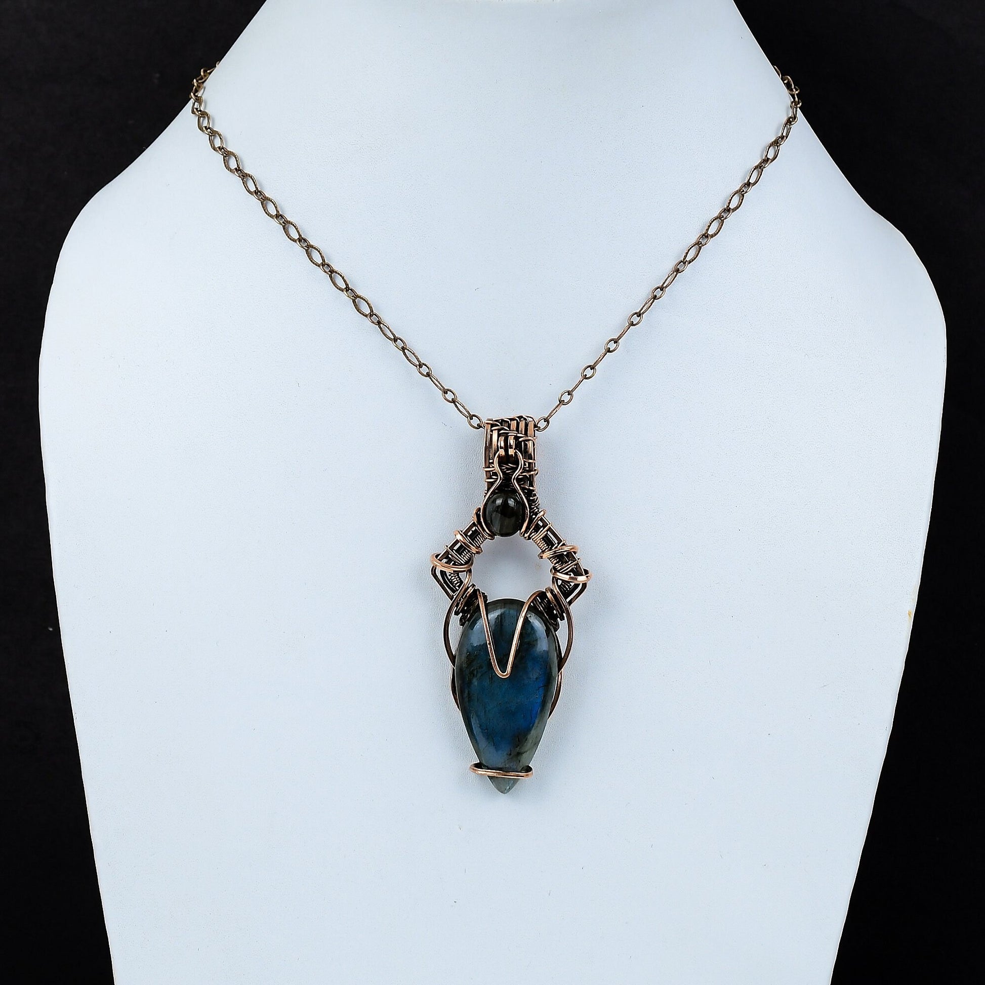 Discover the enchanting allure of our handcrafted labradorite pendant, meticulously wrapped in elegant copper wire.