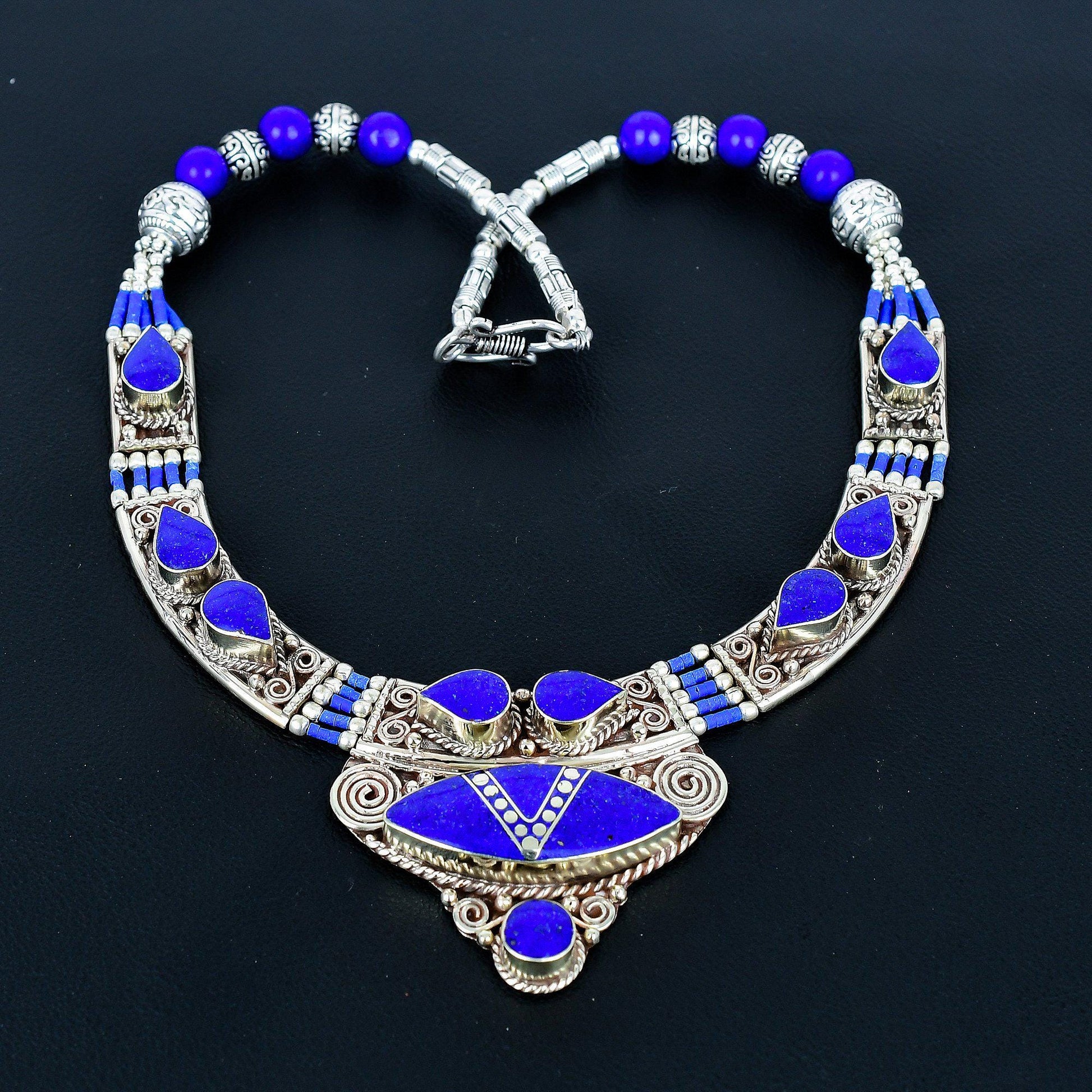 Featuring a stunning array of vibrant blue stones, delicately set in intricate silver-finished metalwork.