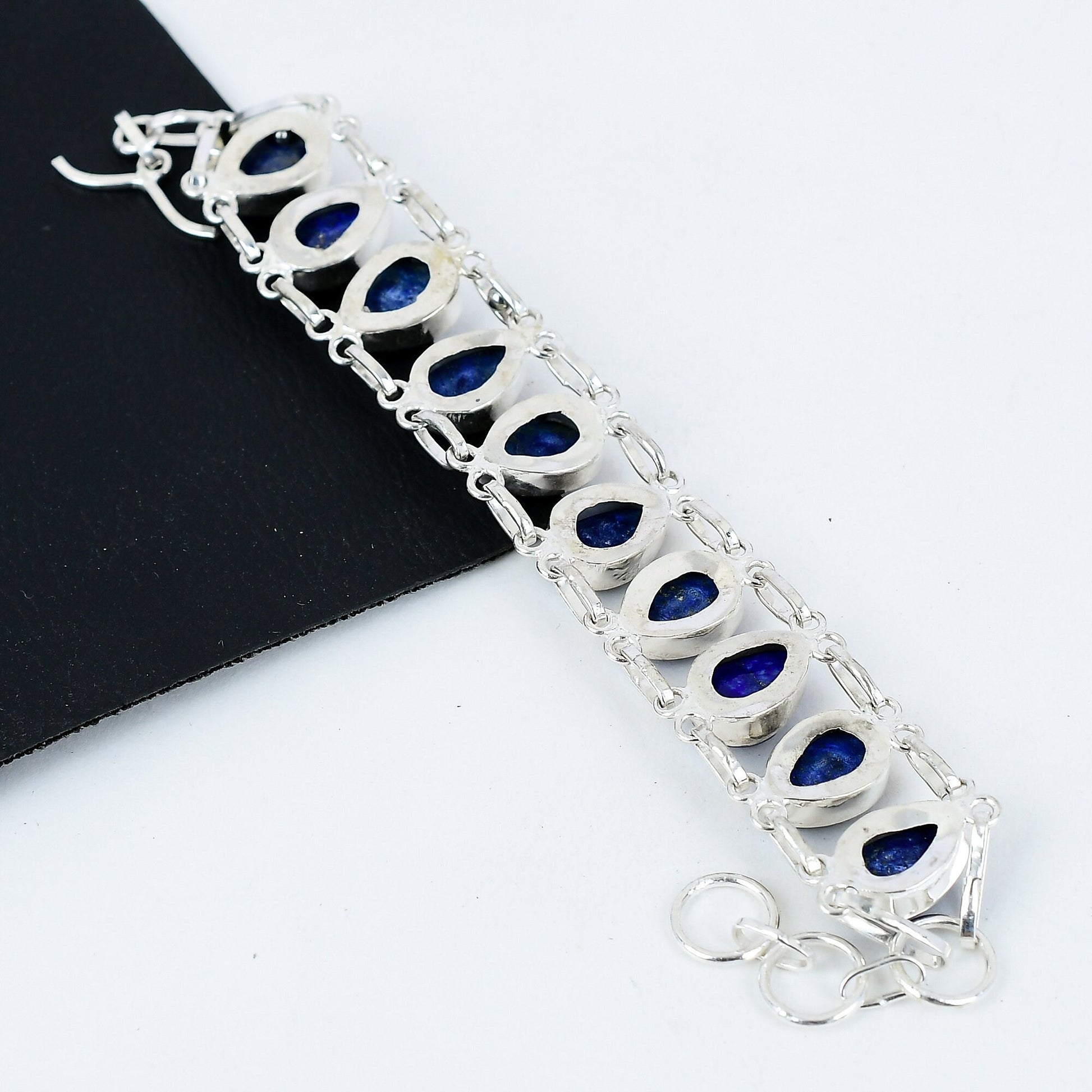 Enhance your elegance with our exquisite Lapis Lazuli Bracelet. Featuring stunning pear-shaped lapis stones, this piece is set in a sleek and durable setting.