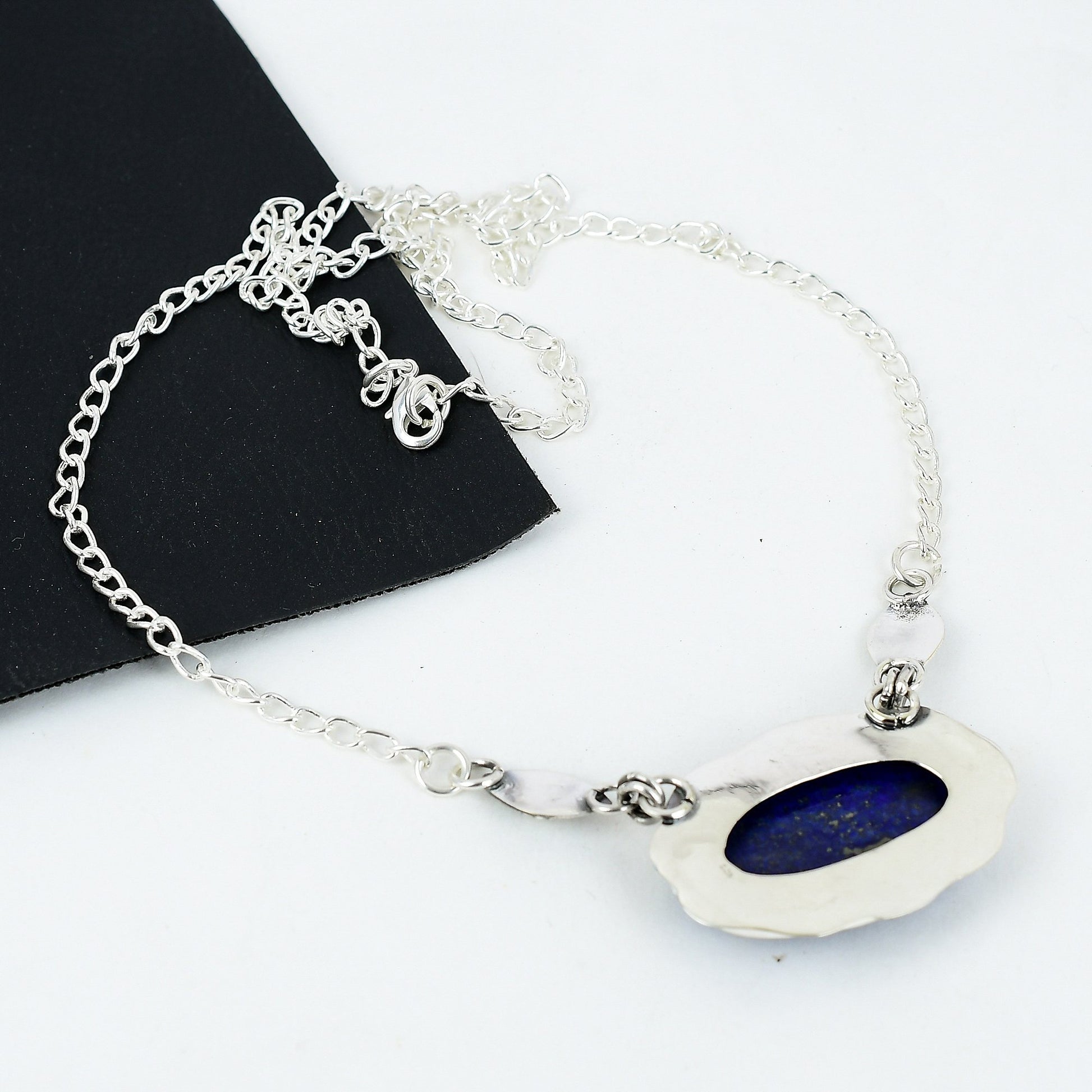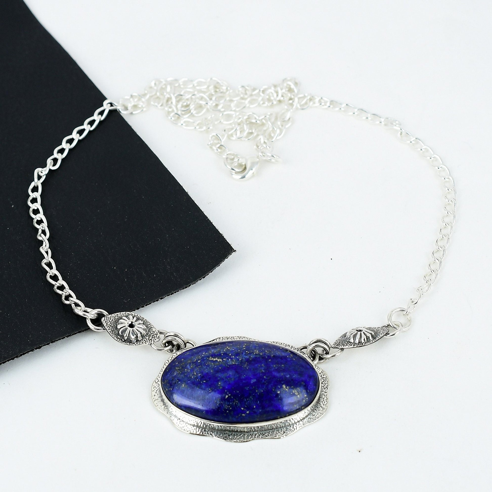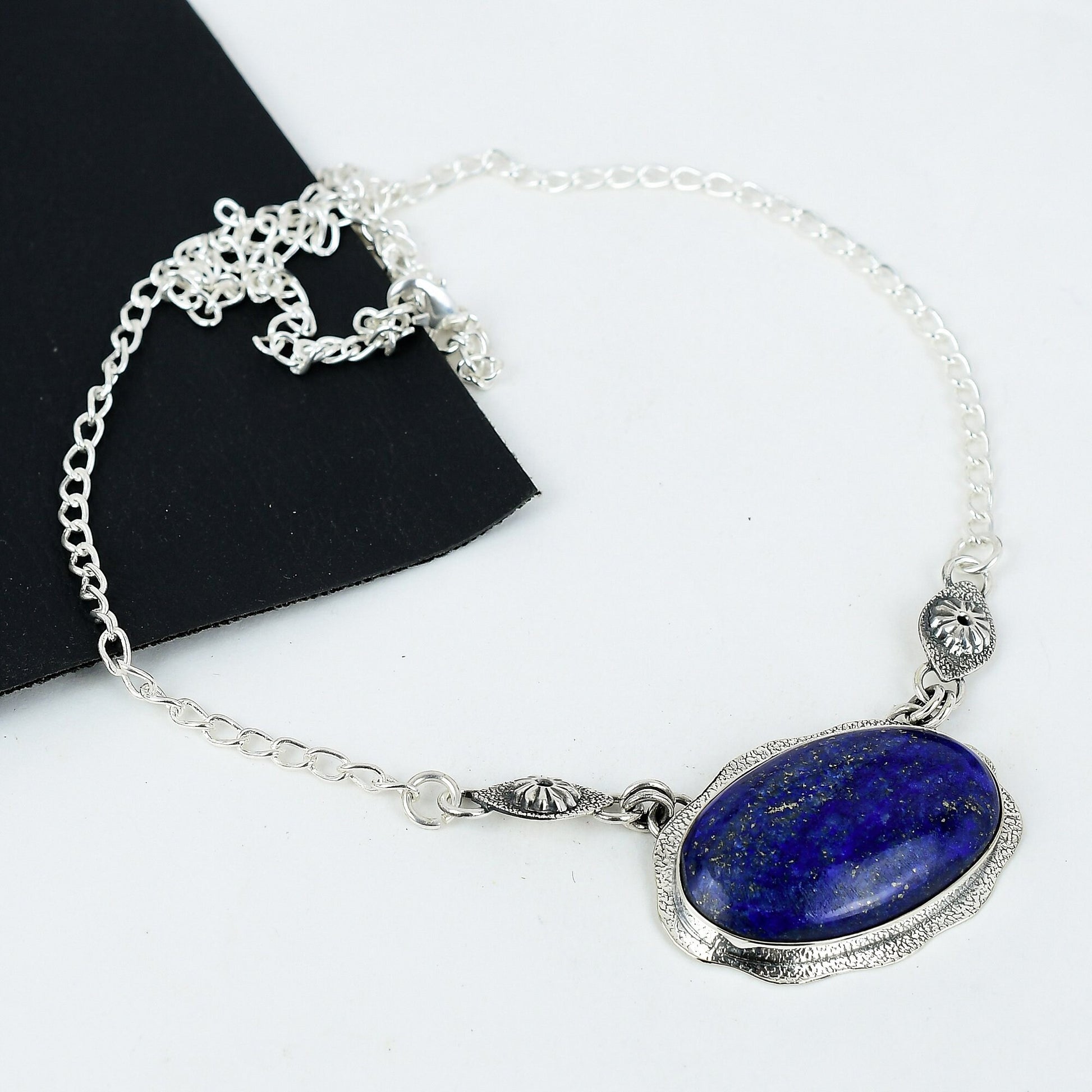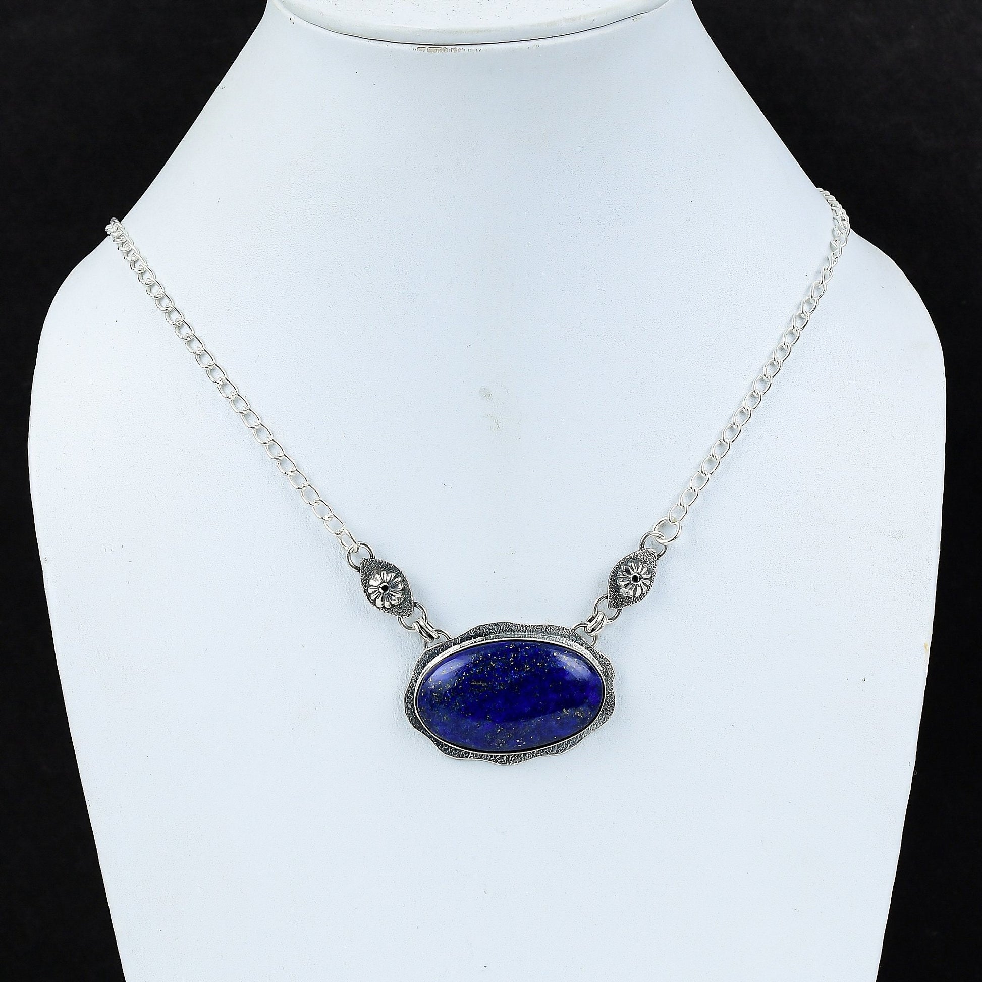 This exquisite piece features a deep blue stone as its centerpiece, framed with intricate silver detailing.