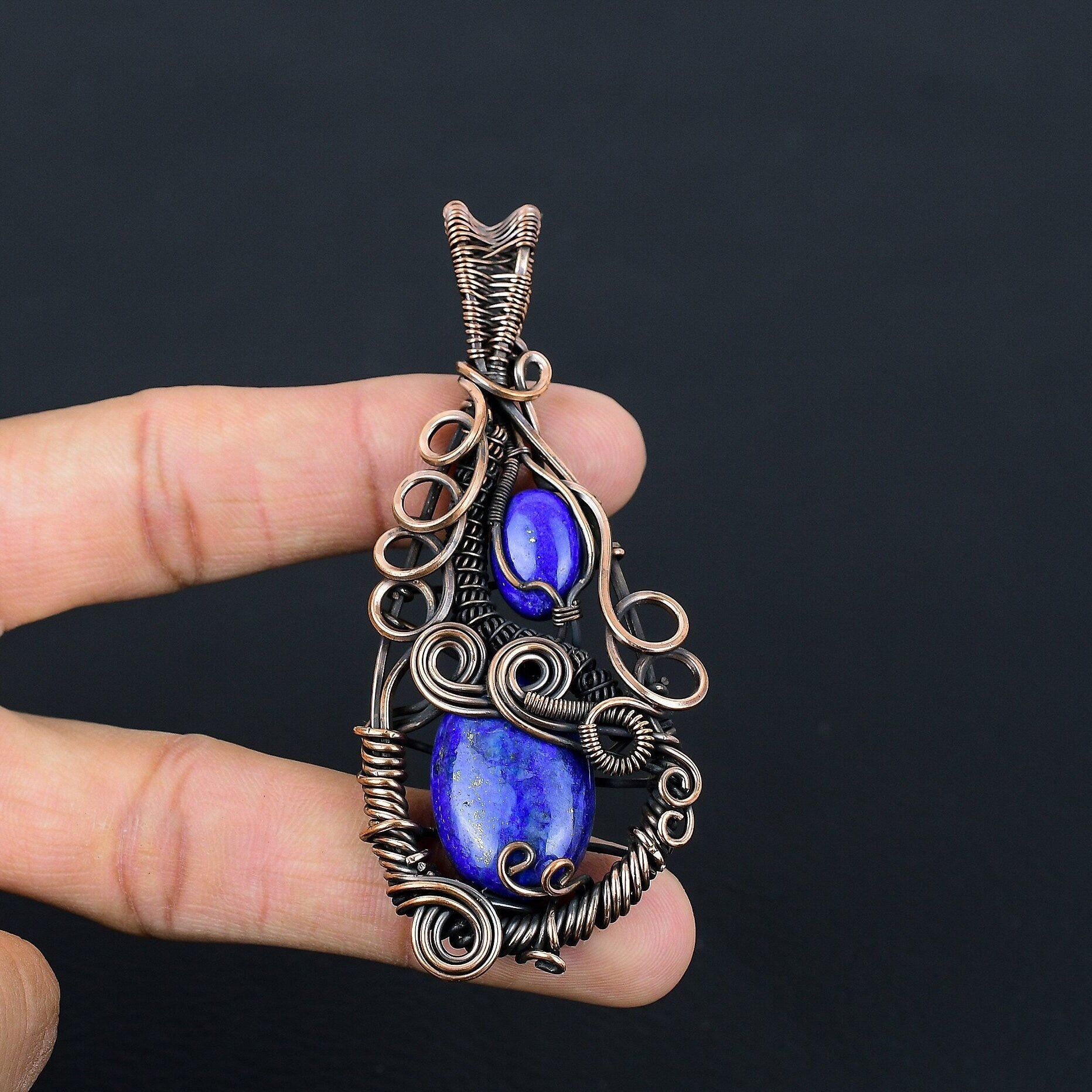 Discover the captivating elegance of our handcrafted Copper Wire Wrapped Pendant. This exquisite piece features a deep blue gemstone, artfully encased in swirling copper wire, creating a harmonious blend of rustic charm and refined sophistication.