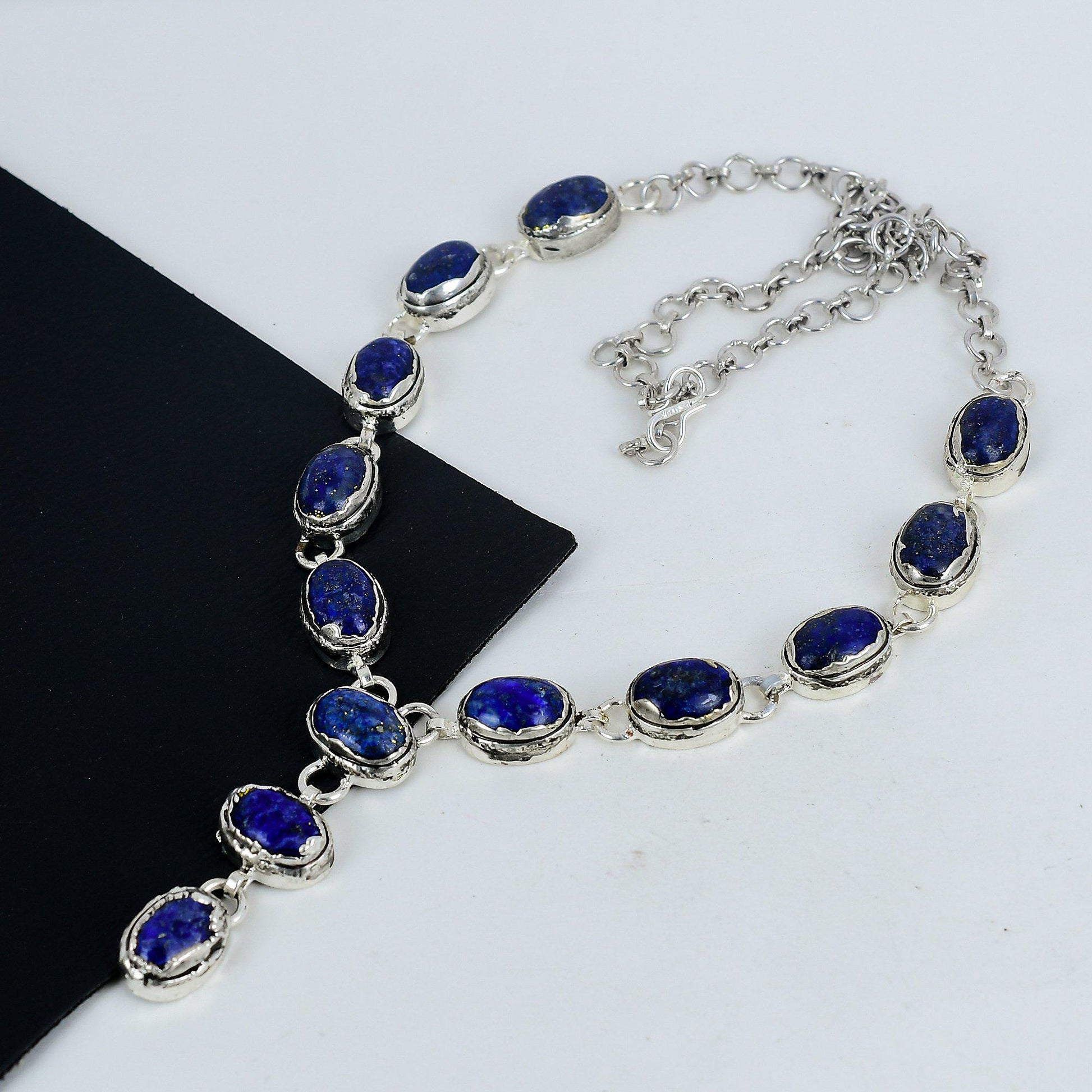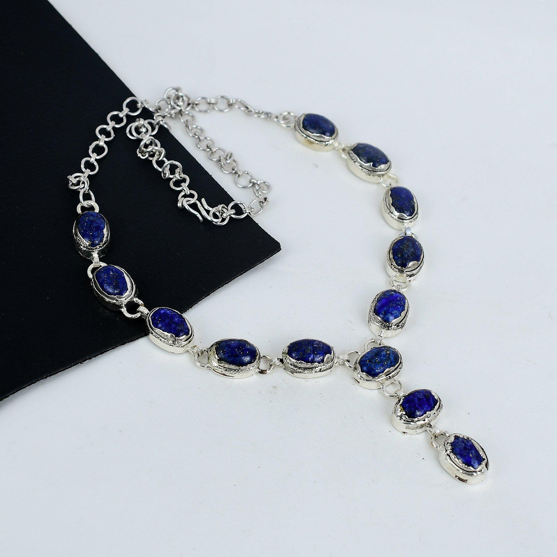 Delve into elegance with this exquisite necklace, showcasing stunning blue gemstones reminiscent of the night sky. Each oval stone, meticulously set in a radiant silver framework, adds a touch of sophistication to any outfit.