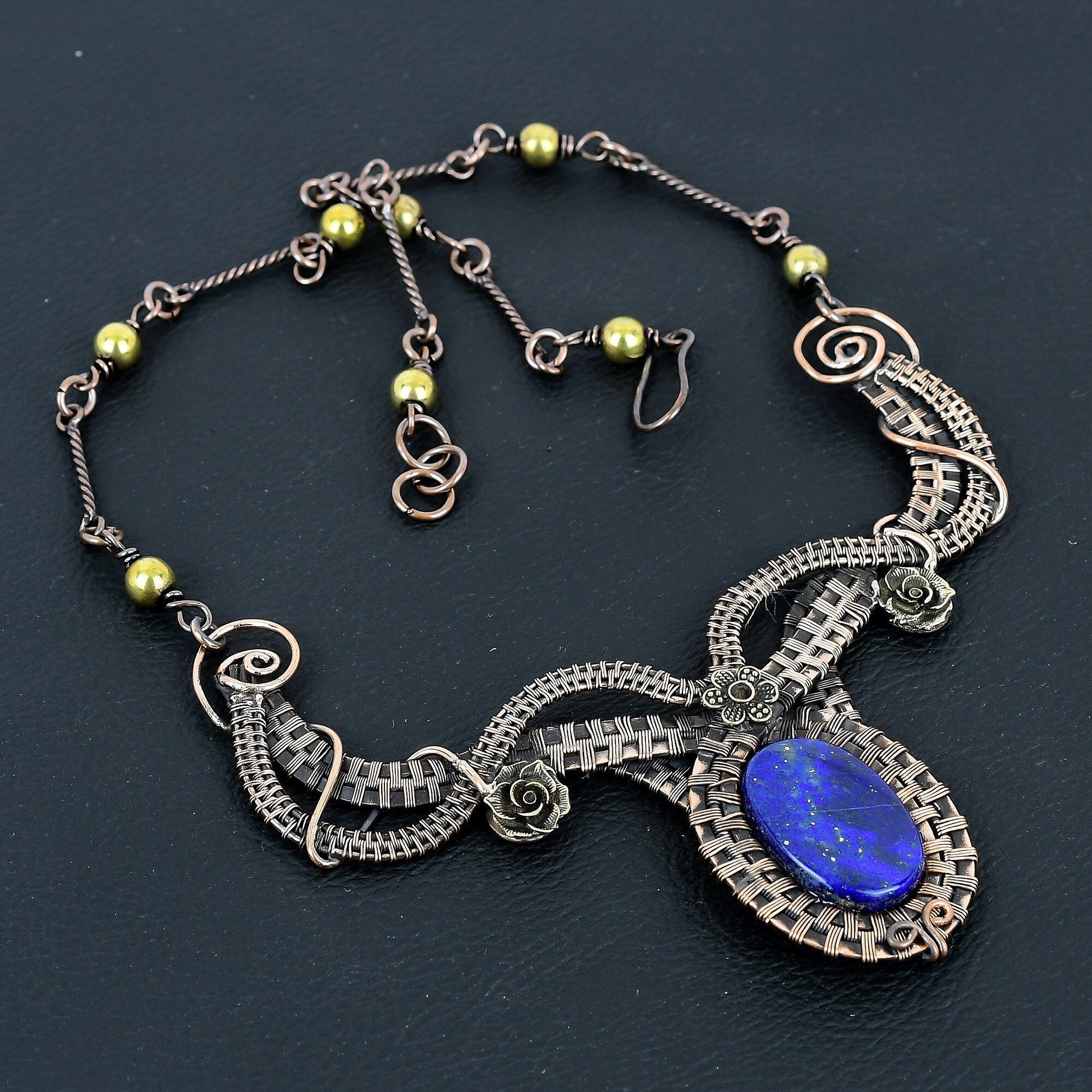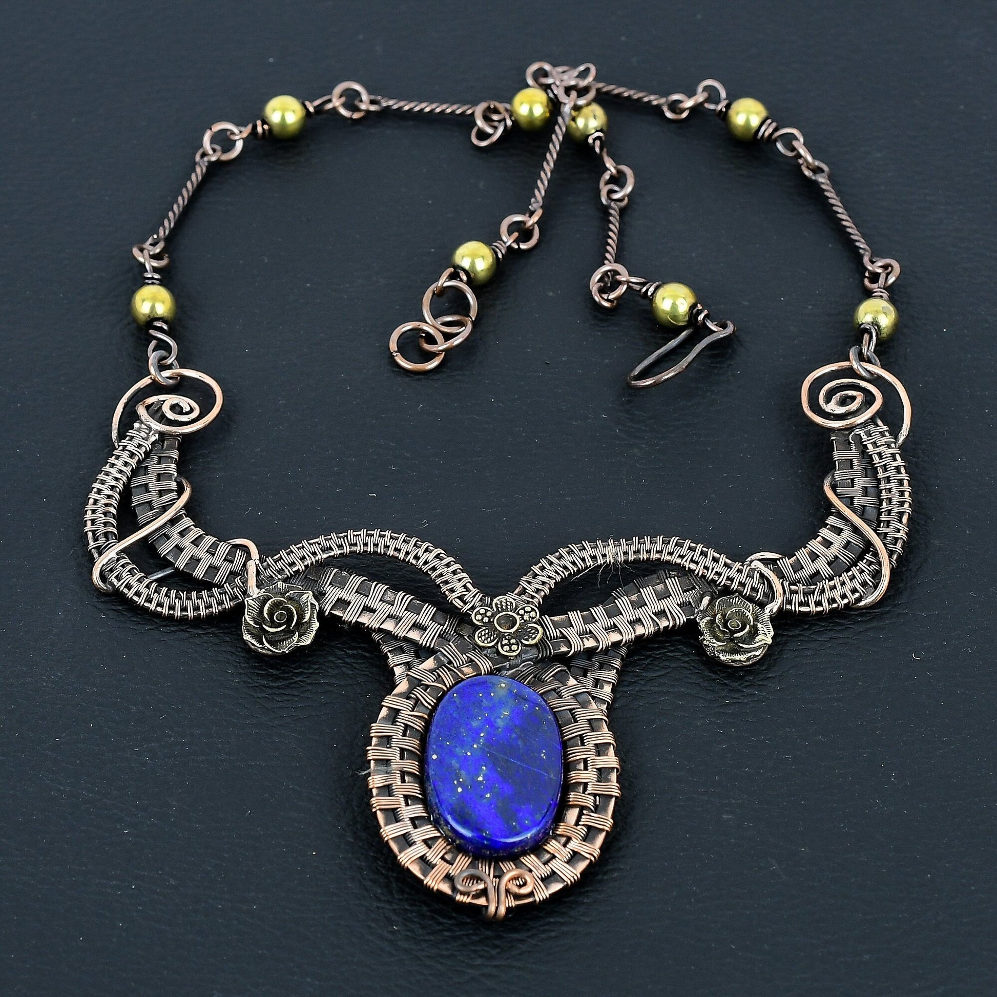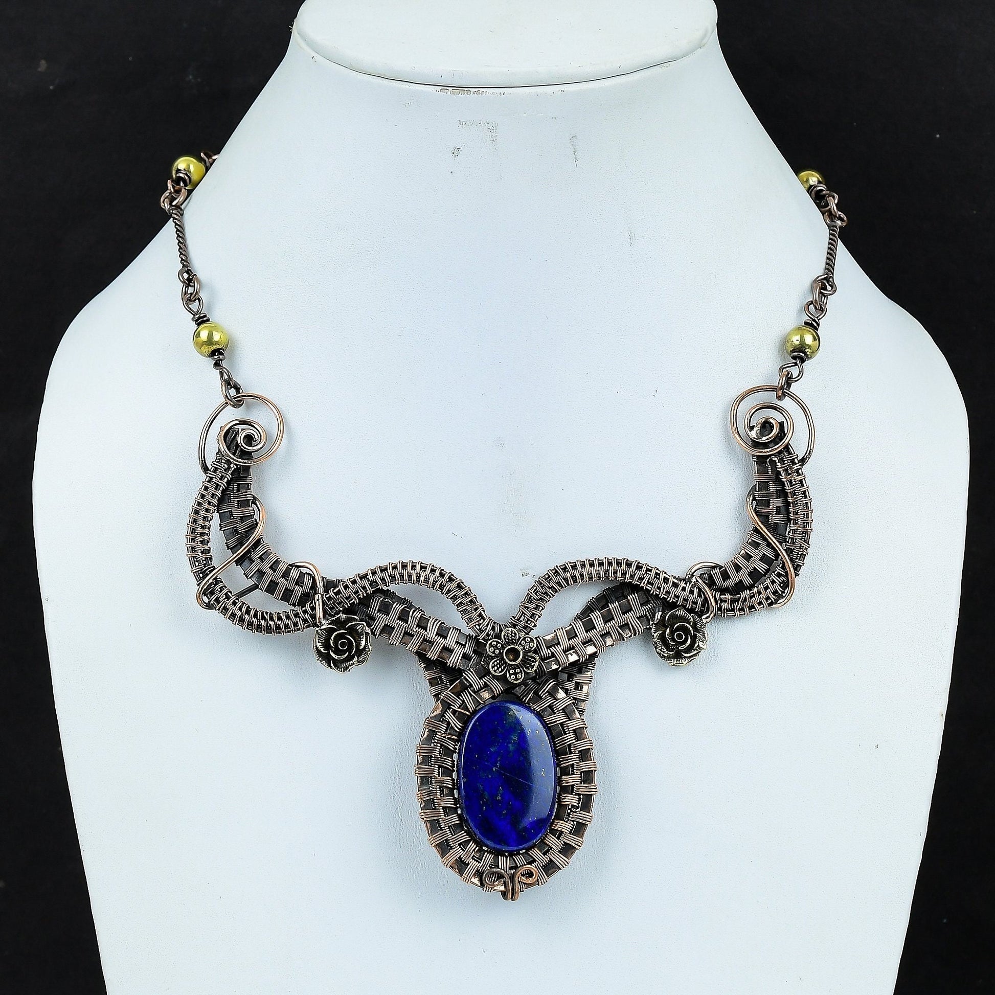 Elevate your style with this intricately designed statement necklace, featuring a captivating blue stone centerpiece surrounded by elegant metalwork.