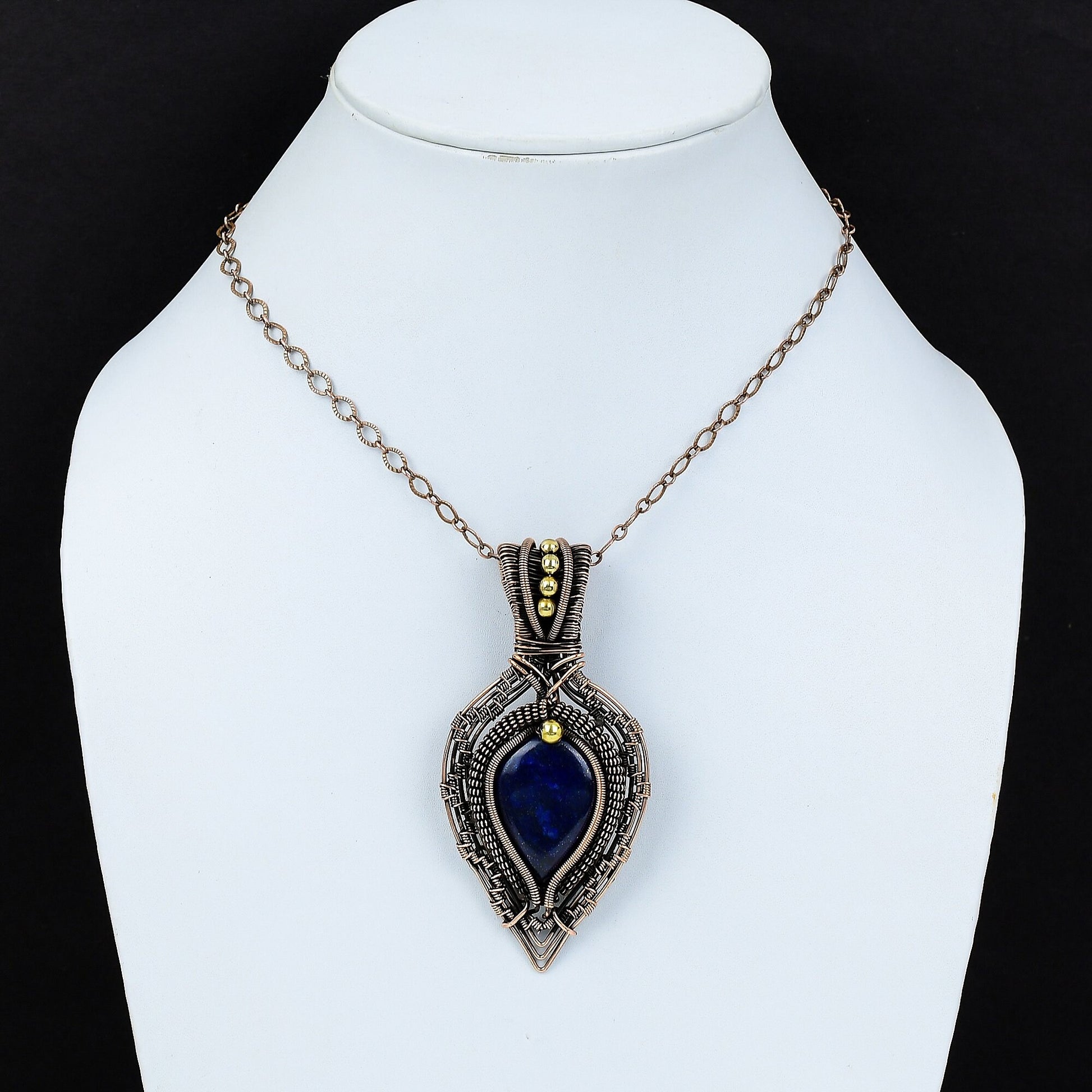 This unique piece features a deep blue gemstone at its heart, meticulously encased in intricately woven copper wire.