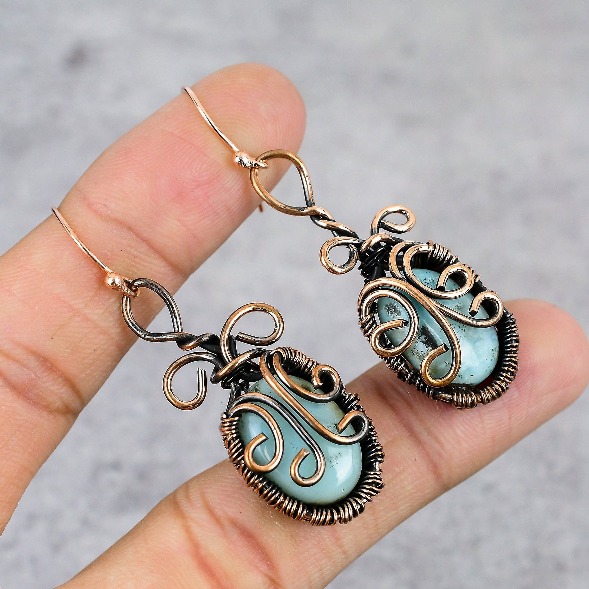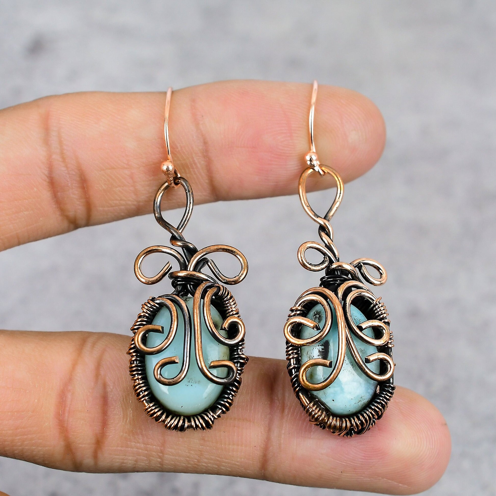 These unique earrings showcase an intricate design, meticulously handcrafted with premium quality copper wire, beautifully weaving around a captivating aqua stone centerpiece.