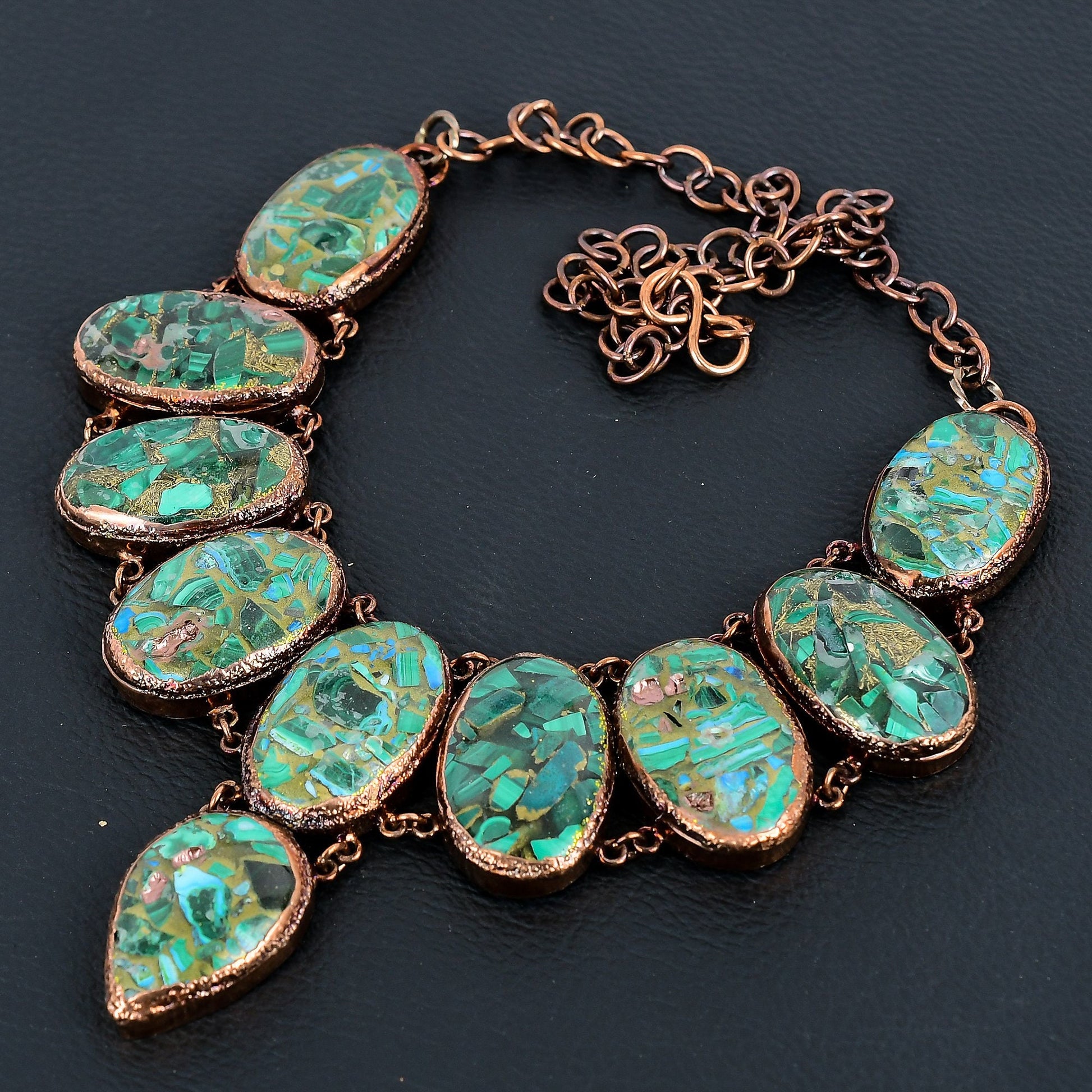 Enhance your elegance with this exquisite statement necklace, featuring a stunning array of turquoise-hued stones intricately set in antique gold settings.