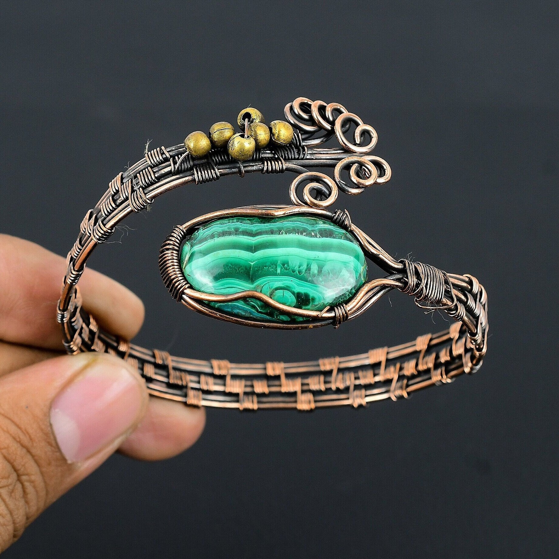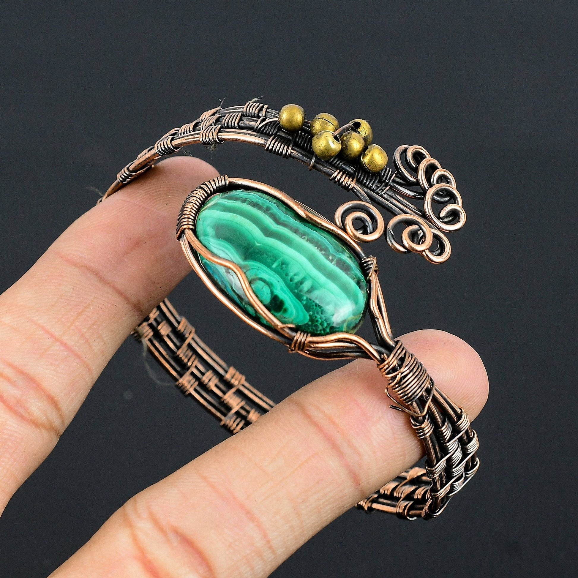 This unique piece combines intricate wire detailing with the vibrant green hues of natural malachite, creating a captivating accessory that exudes sophistication.