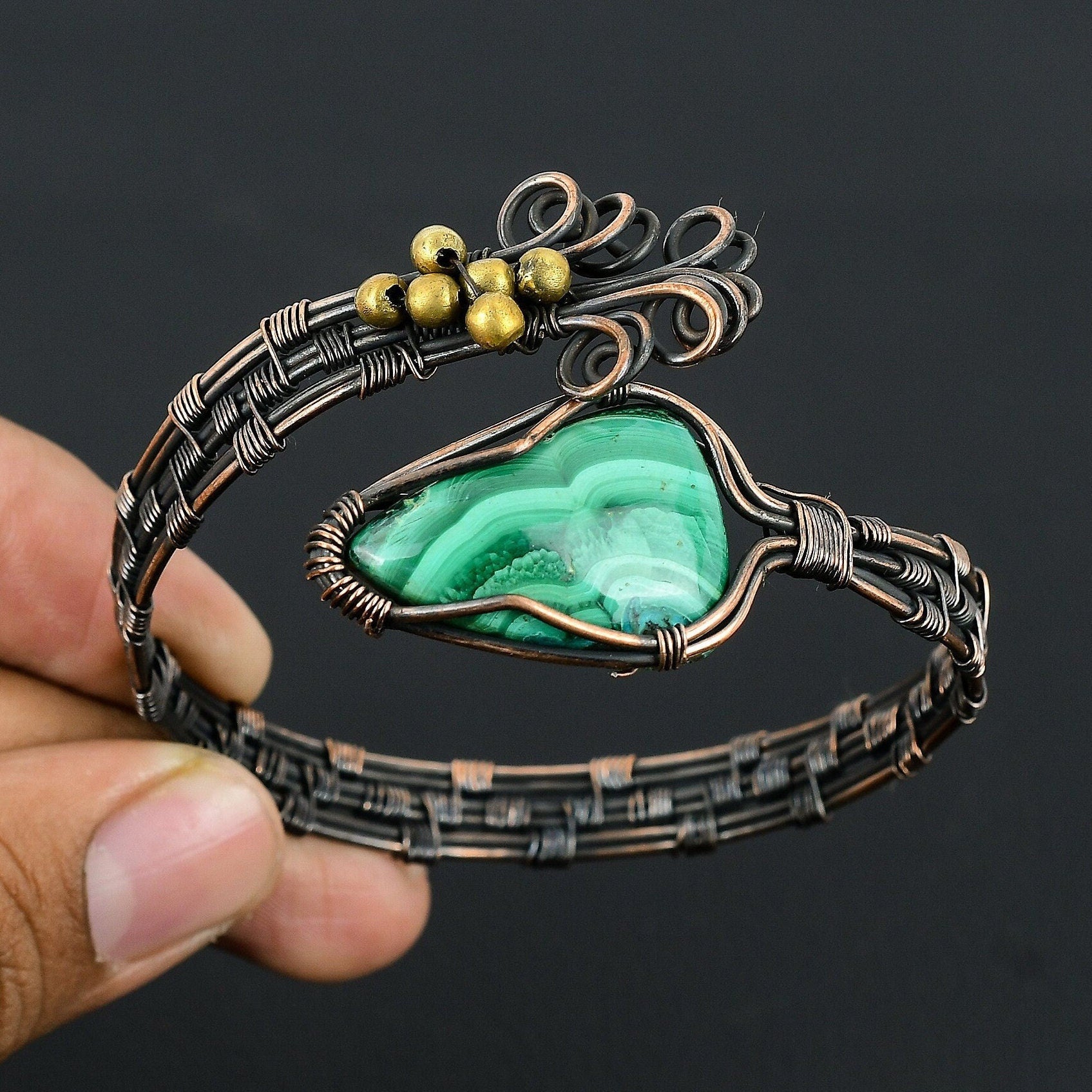 Design: Expertly handcrafted, this bracelet showcases intricate wire work in a combination of copper and silver tones, which elegantly encase the vibrant green stone.