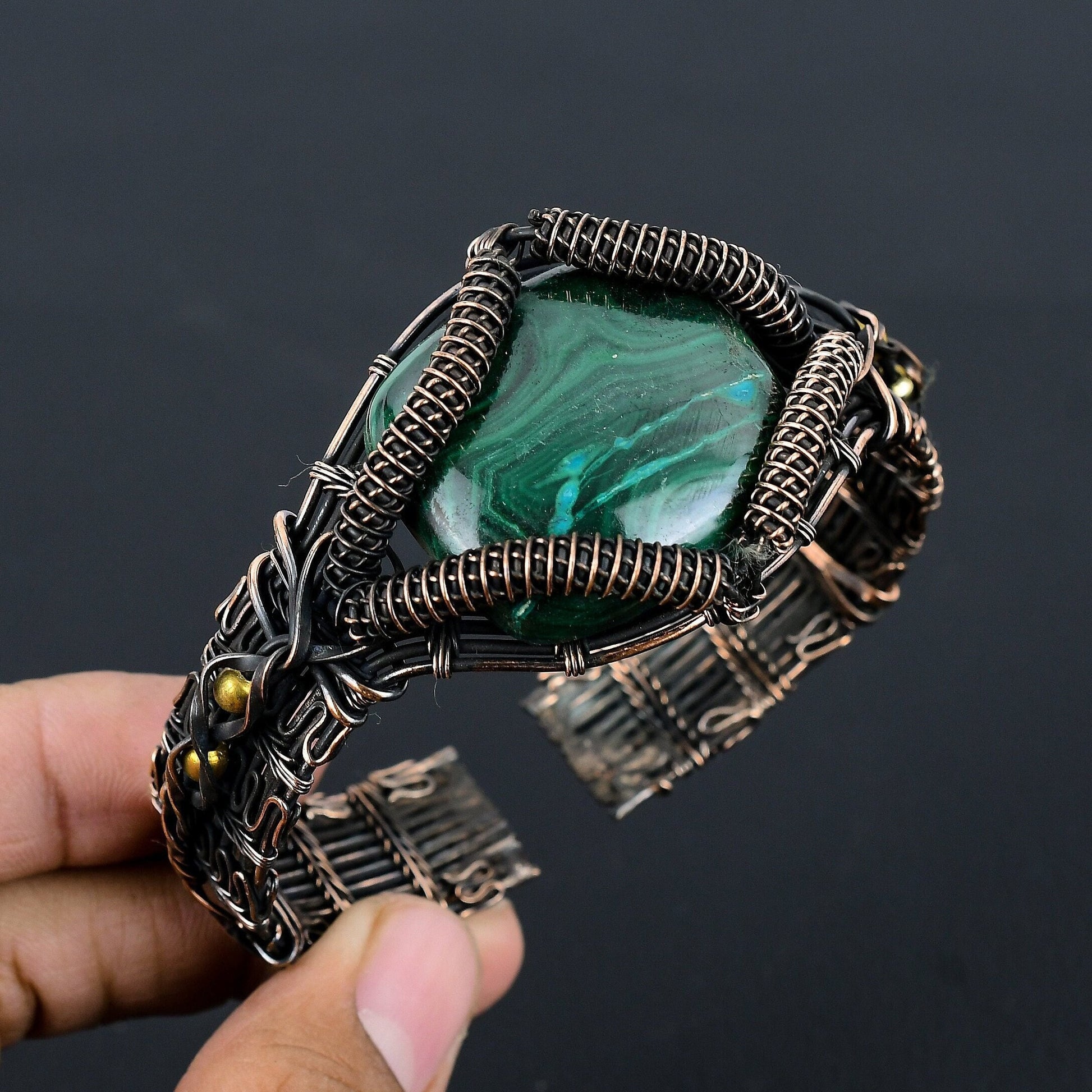 The bracelet showcases expert craftsmanship, with high-quality materials that ensure durability and style. The contrast between the intricate wirework and the smooth, rich green stone creates an eye-catching accessory that complements any attire effortlessly.