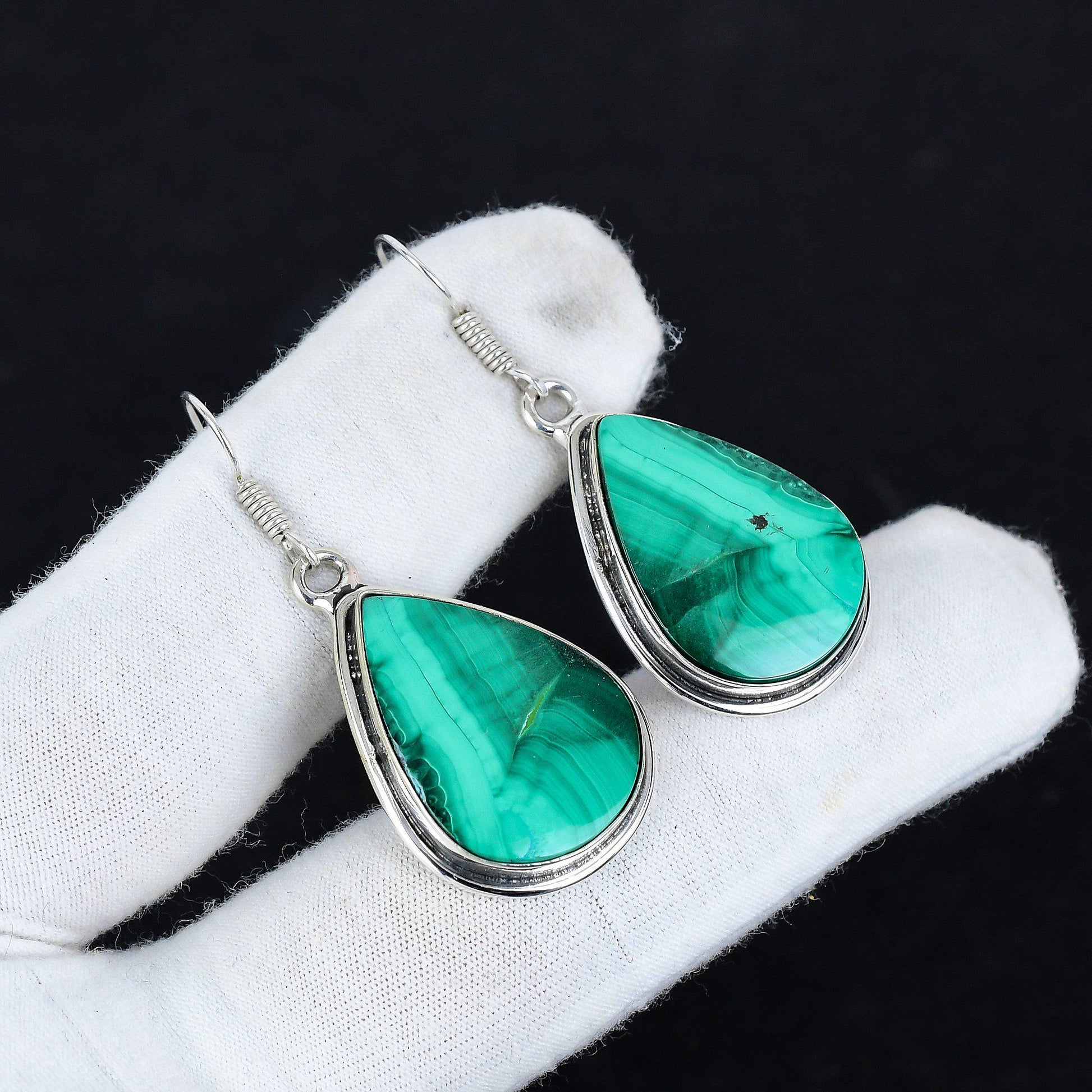 Each earring features a stunning teardrop-shaped malachite stone, known for its vibrant green hues and unique swirling patterns, set in a sleek silver frame.