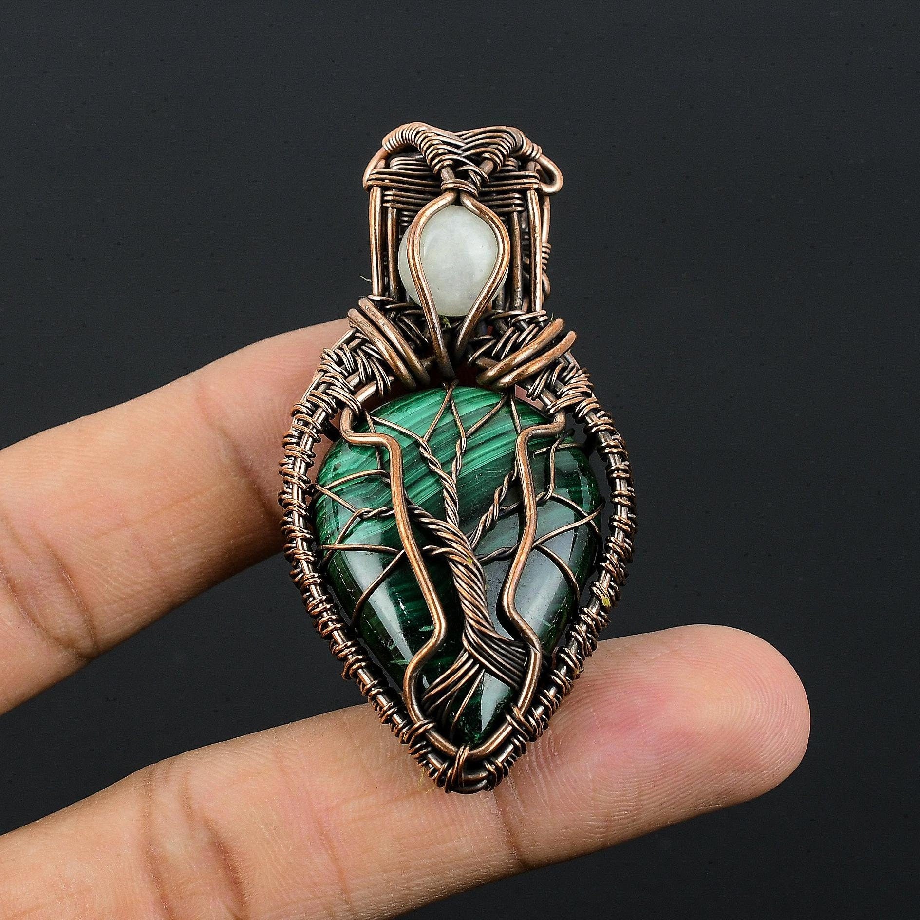 This exquisite piece features a mesmerizing green gemstone meticulously wrapped in antique copper wire, creating an intricate and unique tree of life design.