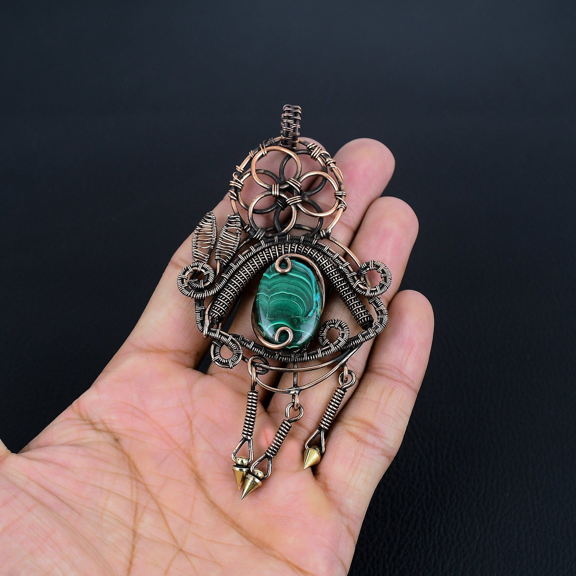 Introducing our exquisite handcrafted copper wire pendant, a unique blend of artistry and elegance. This stunning piece features an intricate wire-wrapped design, crafted meticulously to showcase a vibrant malachite gemstone at its heart.