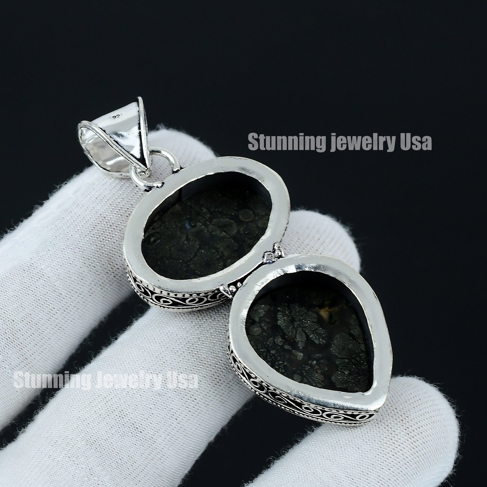 This stunning jewelry piece features two large black agate stones adorned with intricate silver detailing, making it an ideal accessory for any occasion.