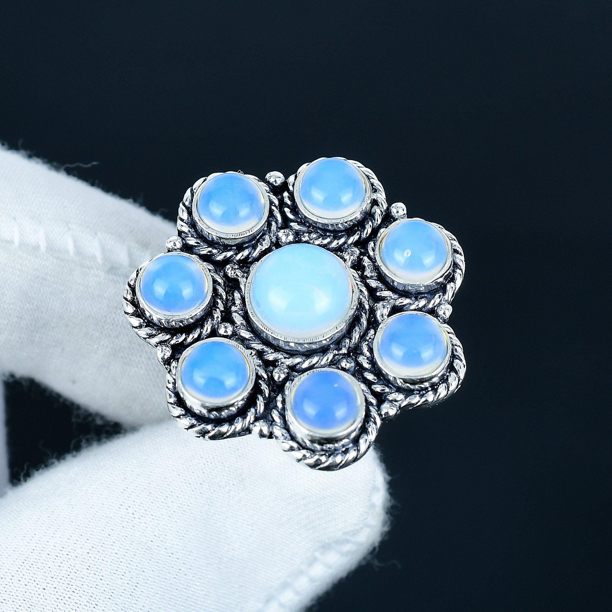 Design: Adorned with a central opal stone, surrounded by six smaller luminous opals, each set within intricately detailed sterling silver, forming a captivating floral motif.