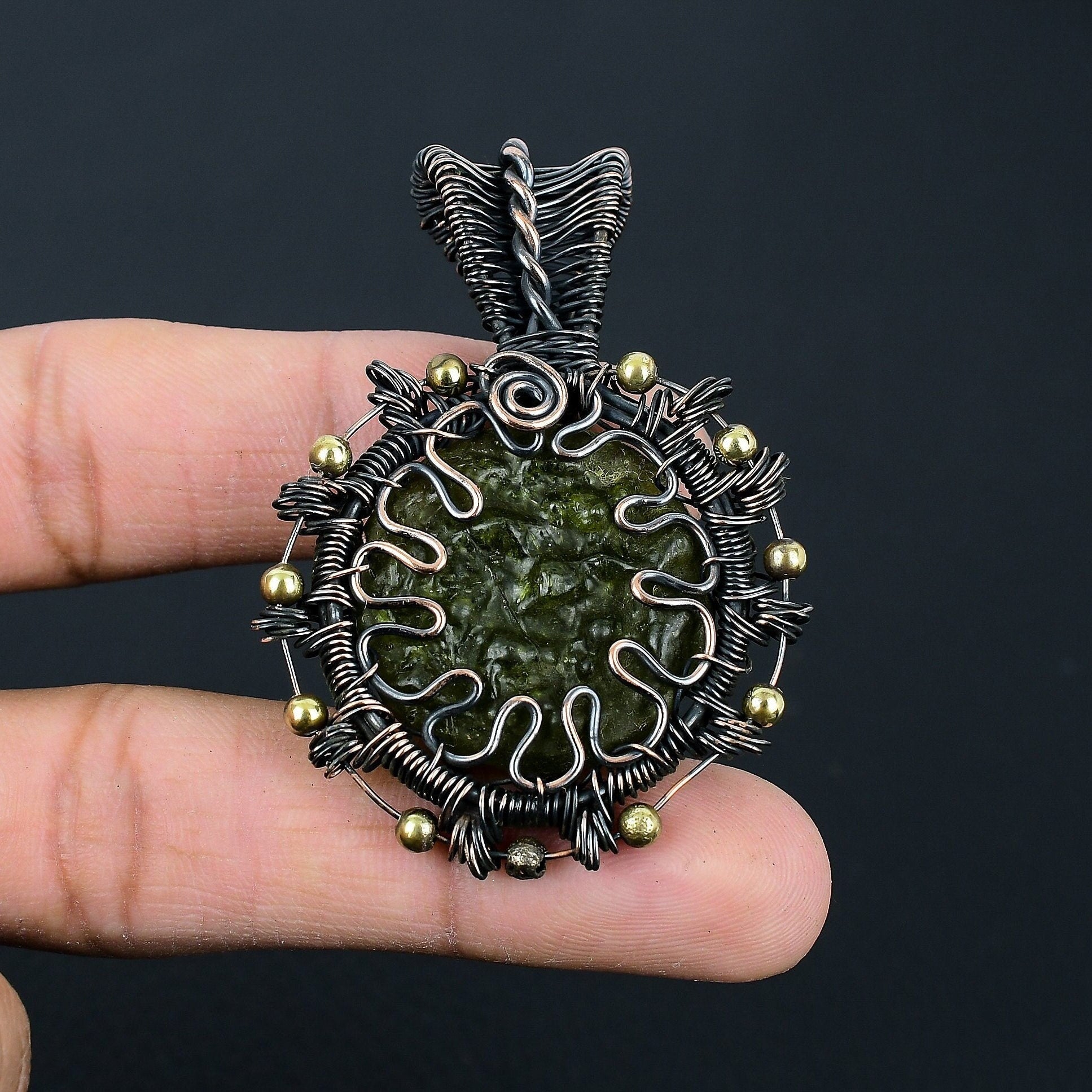 This pendant features a raw, uncut moldavite stone, renowned for its mystic green hue that shimmers with celestial energy. Encased in intricate wirework, the design is enhanced with delicate metal accents, adding a touch of vintage charm.