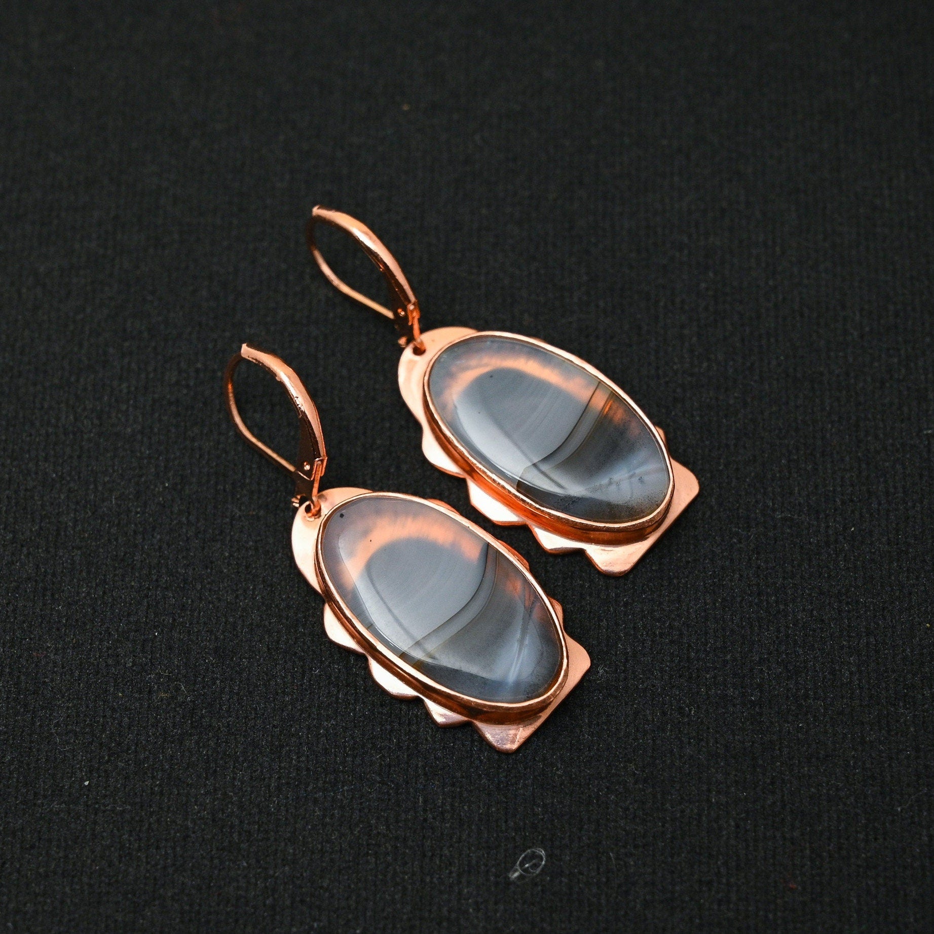 Discover the elegance of our exquisite Rose Gold Oval Drop Earrings. Crafted to perfection, these earrings feature a stunning polished stone set in a graceful copper-toned frame.