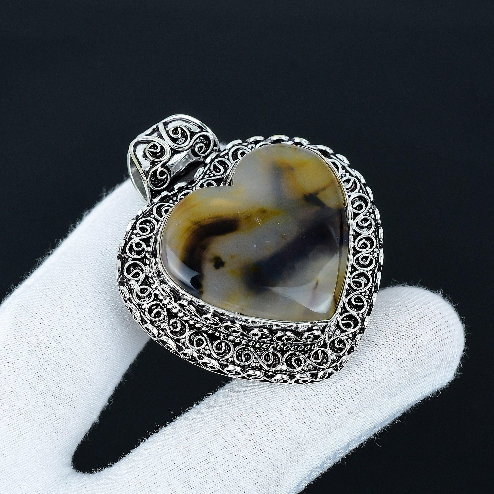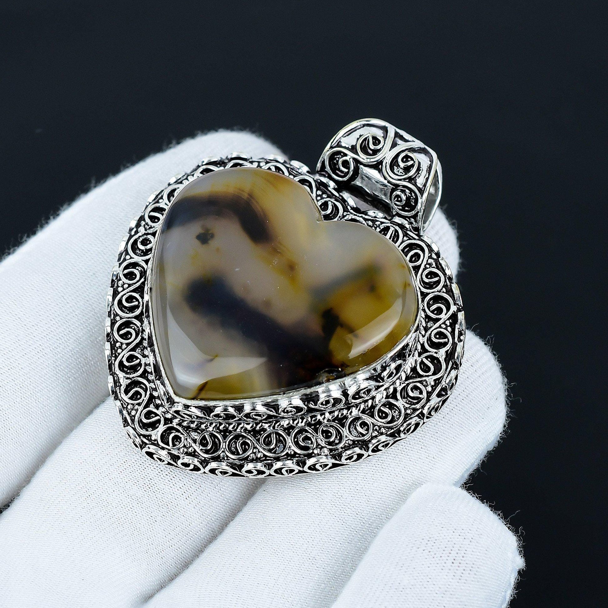 Design: This pendant features a stunning heart-shaped amber stone, renowned for its warm hues and natural inclusions, set within intricate, decorative silver detailing.