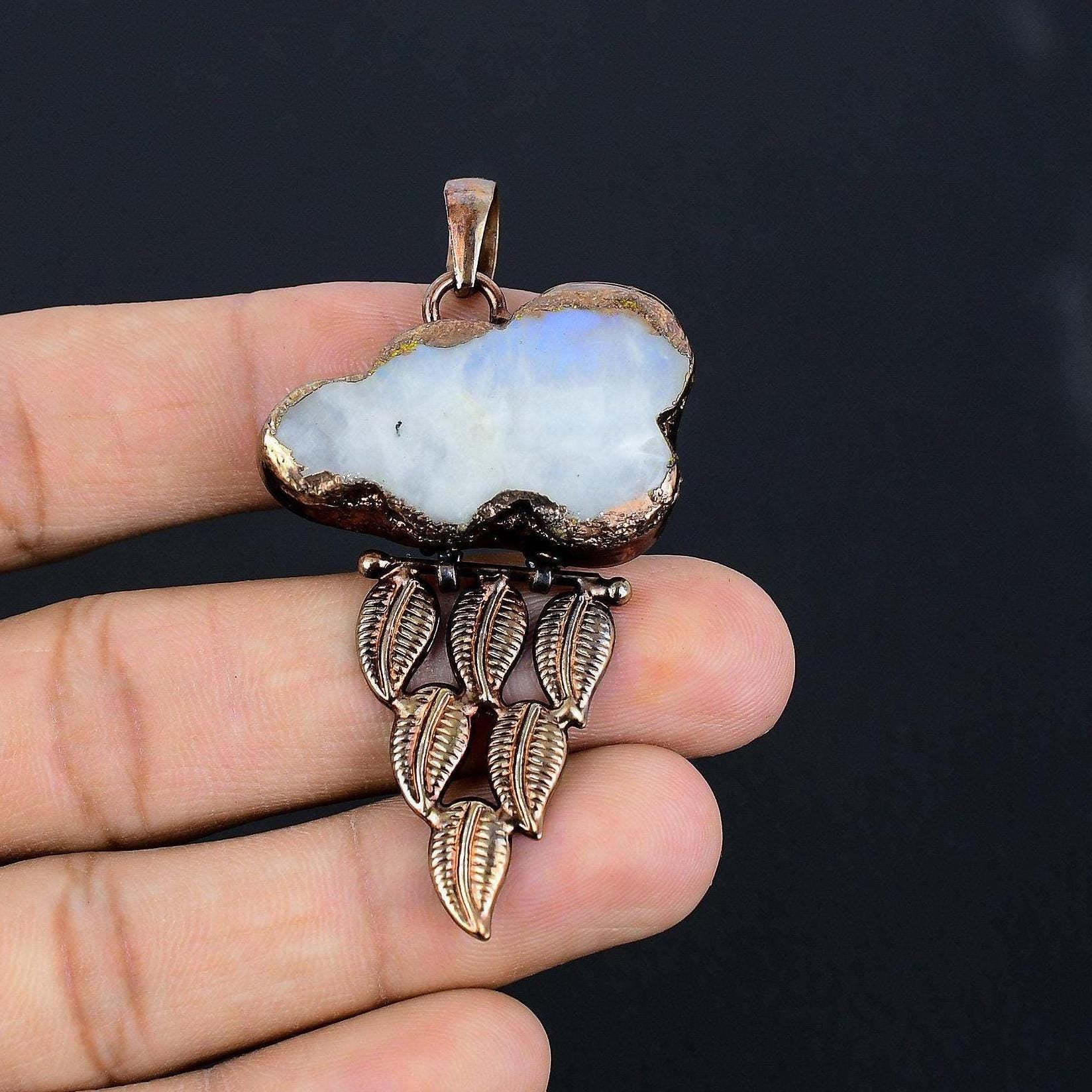 Elevate your style with this exquisite handcrafted pendant, featuring a stunning cloud-shaped stone with ethereal hues of blue and white. Encased in a beautifully detailed copper setting, this unique piece is a perfect blend of elegance and artistry.