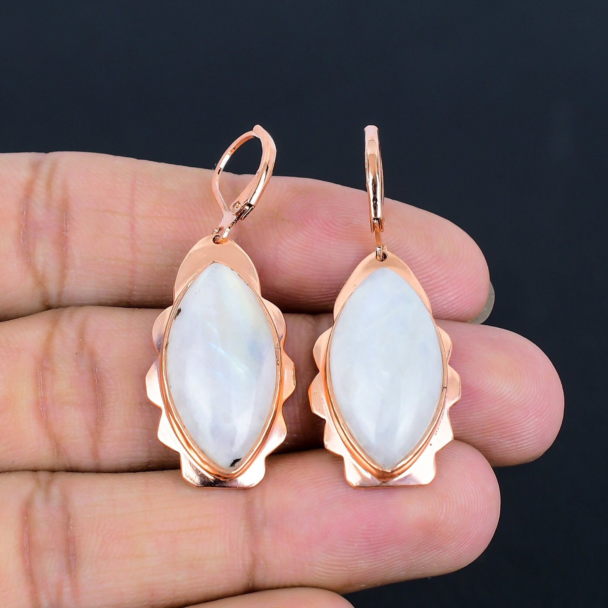Experience the elegance and magic of our Moonstone Rose Gold-Plated Earrings. These exquisite pieces feature stunning marquise-shaped moonstones, set in intricately crafted rose gold-plated mounts.