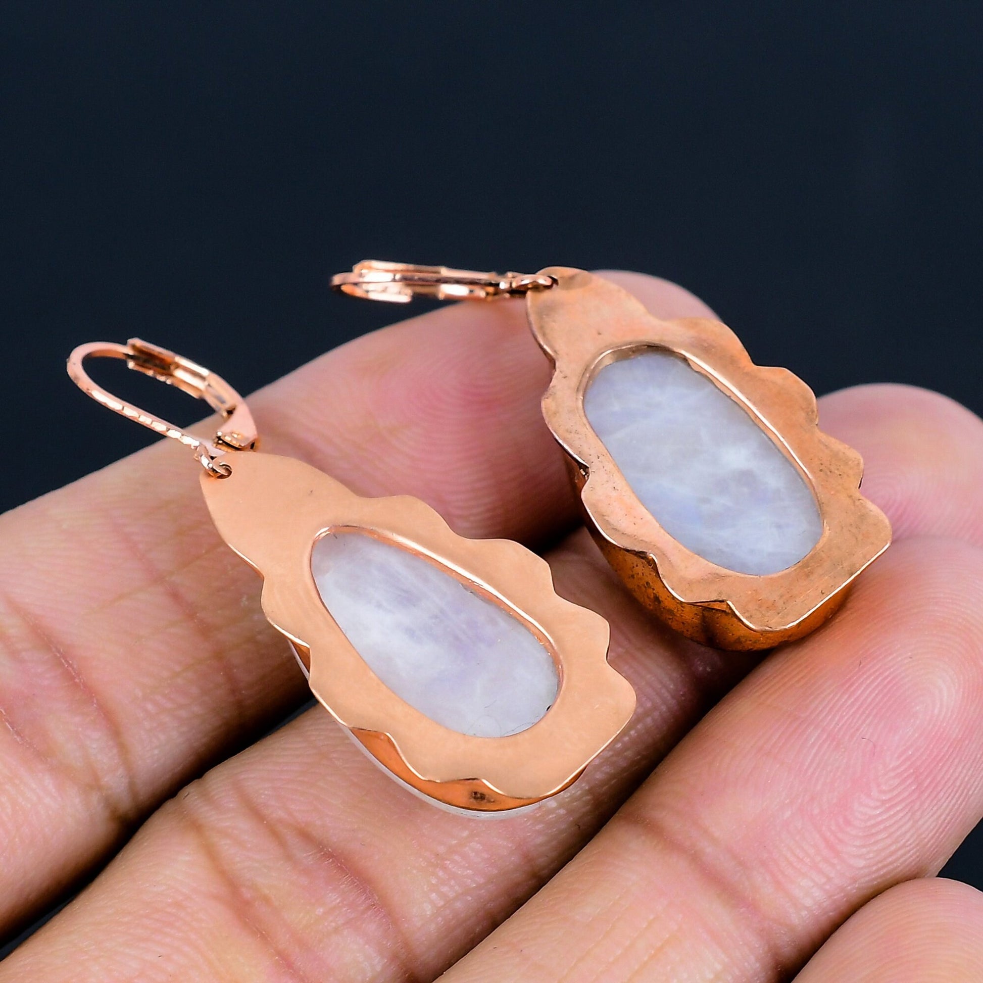 Featuring a lustrous rose gold finish and delicate craftsmanship, these earrings are adorned with premium moonstone that shimmers with a mystical glow.