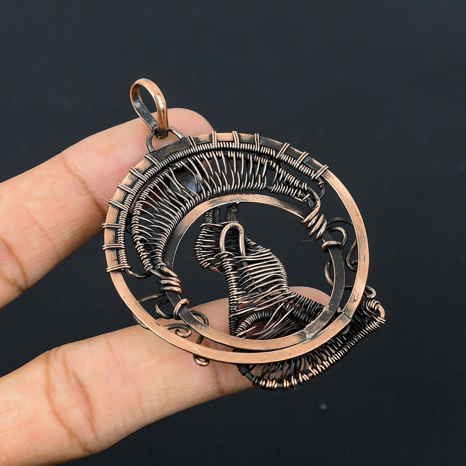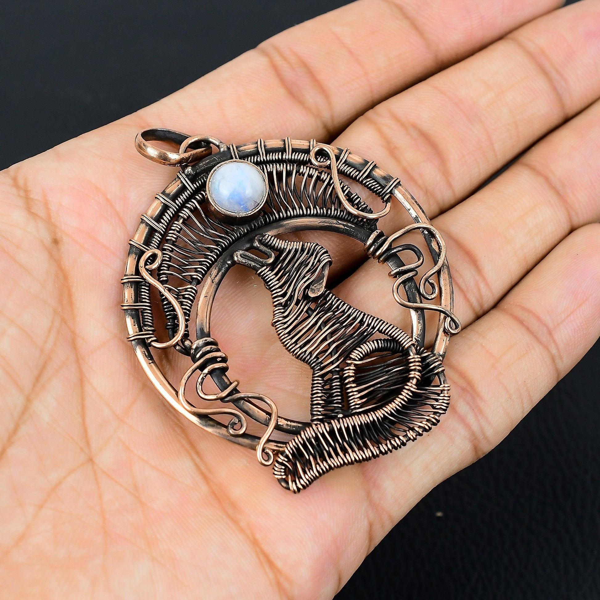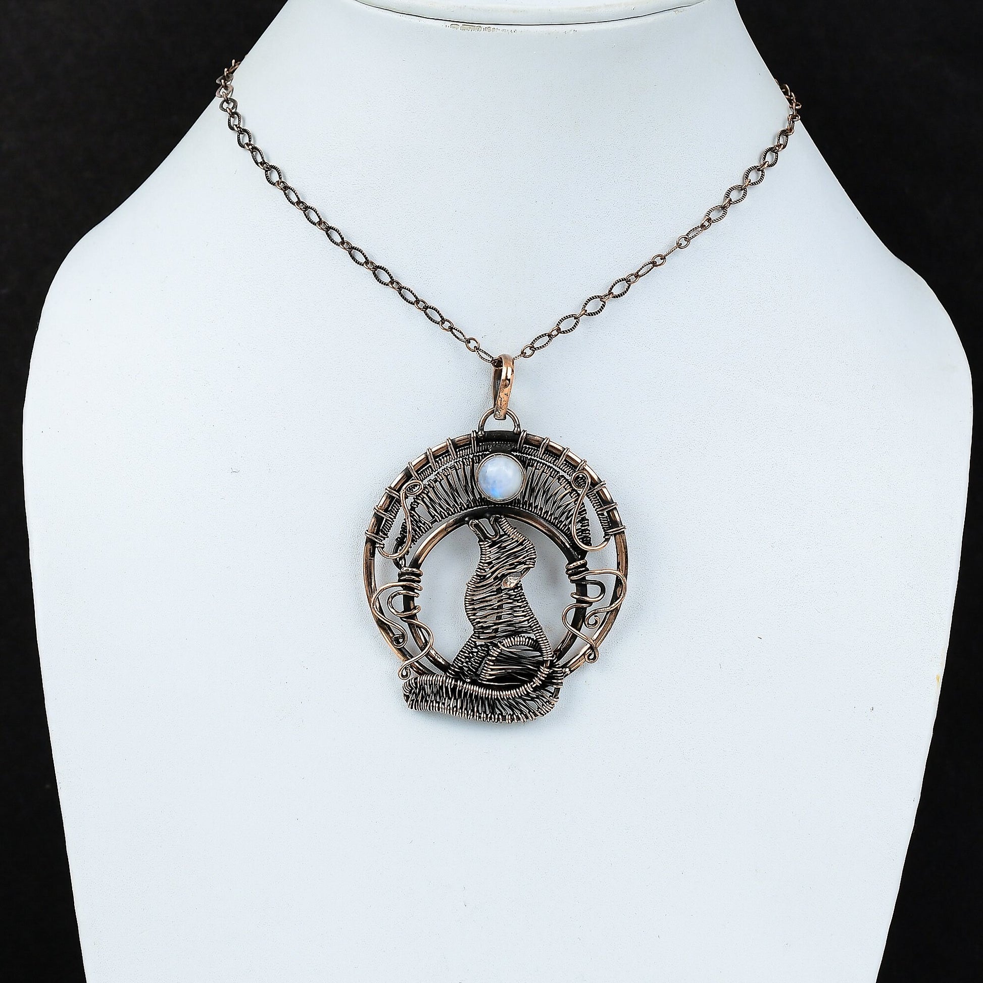 Experience the mystical allure of our handcrafted Copper Moon Wolf Pendant.