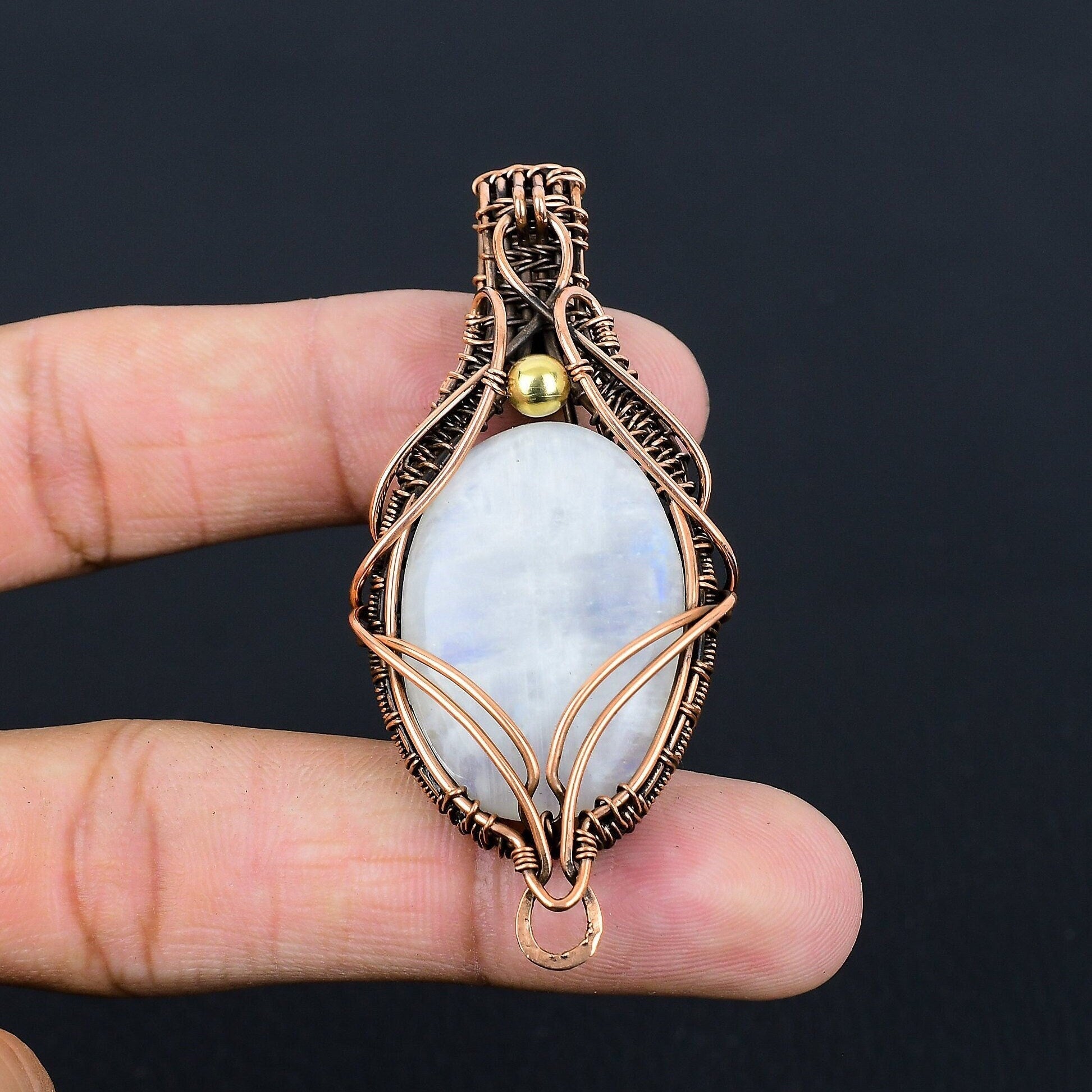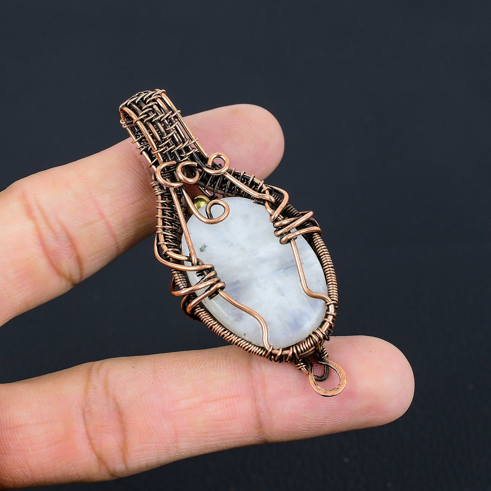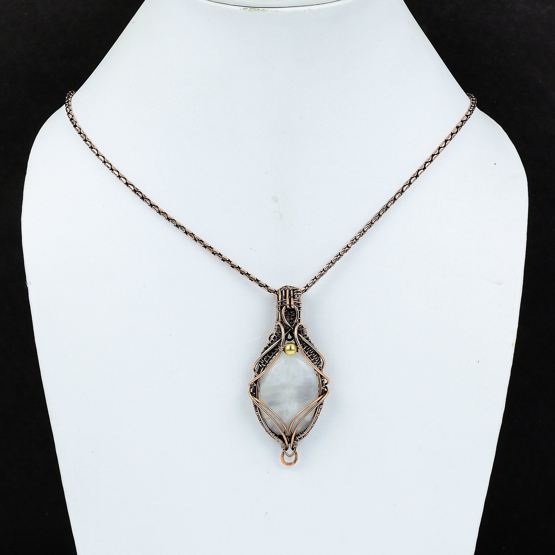 This unique piece features a beautiful moonstone secured by intricate copper wire wrapping, highlighting its natural, ethereal beauty.