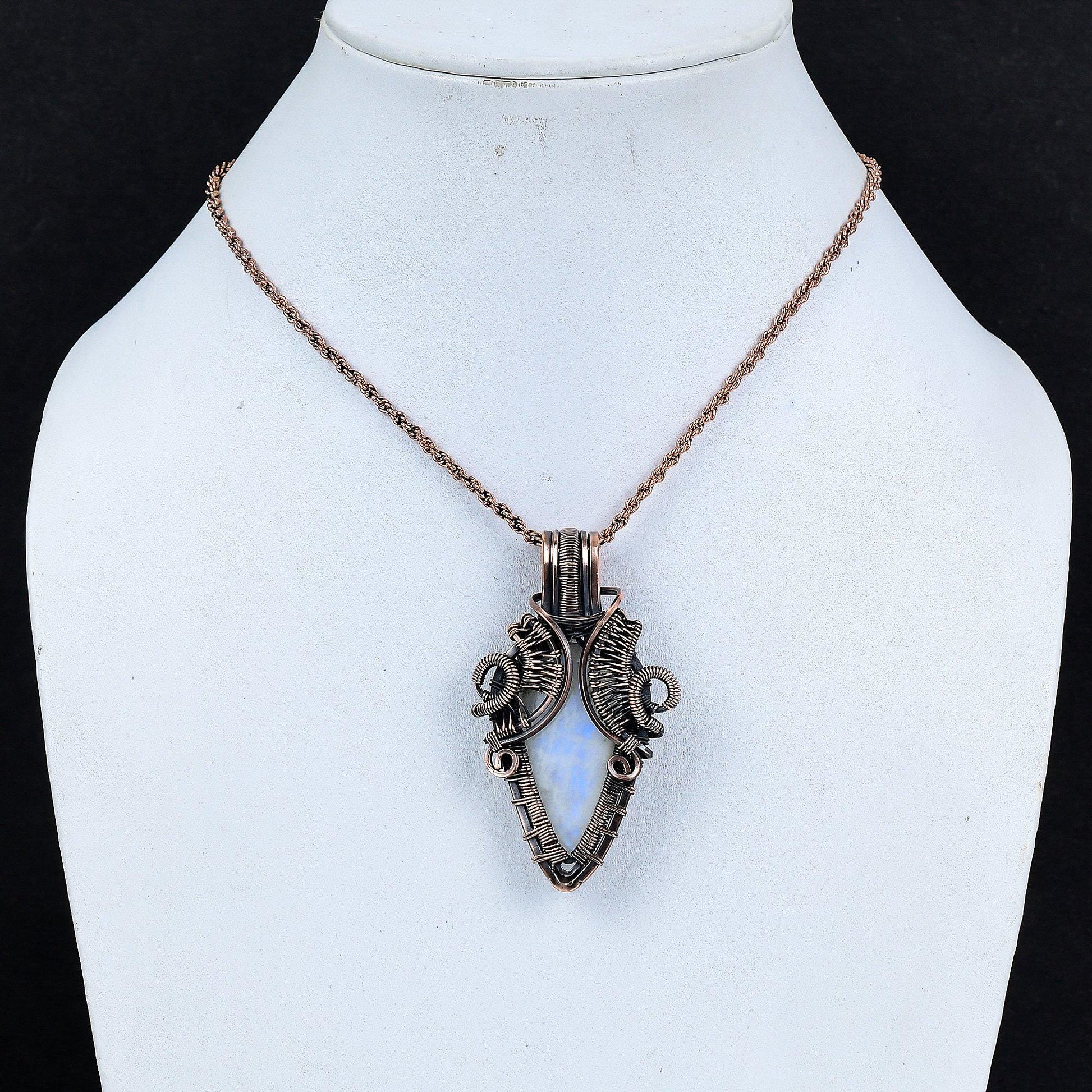 Featuring a stunning moonstone centerpiece, this exquisite piece is meticulously crafted with intricate copper wire detailing, creating a unique and elegant design.