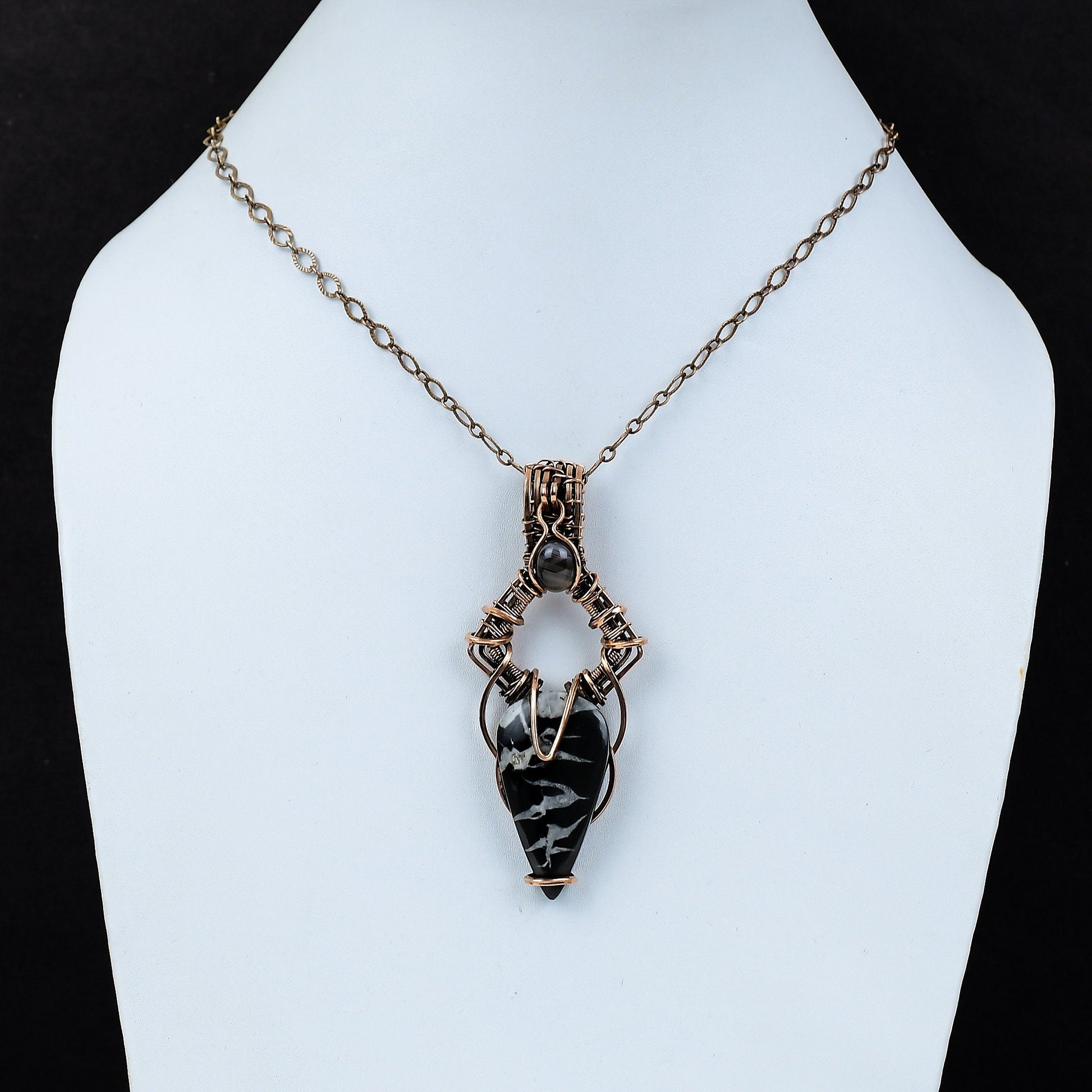 Introducing our exquisite handcrafted pendant, a true masterpiece of artisan jewelry design. This unique piece features a beautifully polished stone, elegantly wrapped in intricate copper wire, showcasing the harmonious blend of natural beauty and skilled craftsmanship.