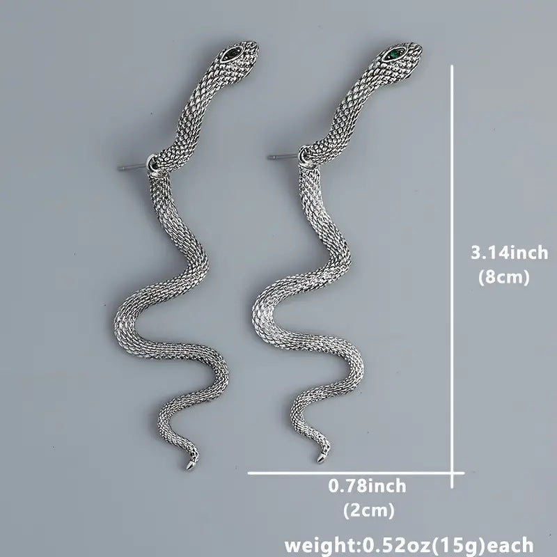 These snake earrings feature a striking and bold design inspired by animal and zodiac symbolism, available in three captivating finishes: Forever Black, Ancient Gold, and Antique Silver. Crafted from durable alloy with a diamond treatment process, these earrings are designed for women seeking an edgy yet elegant accessory. Their unique snake motif adds an air of mystique and sophistication, perfect for both casual and formal occasions.