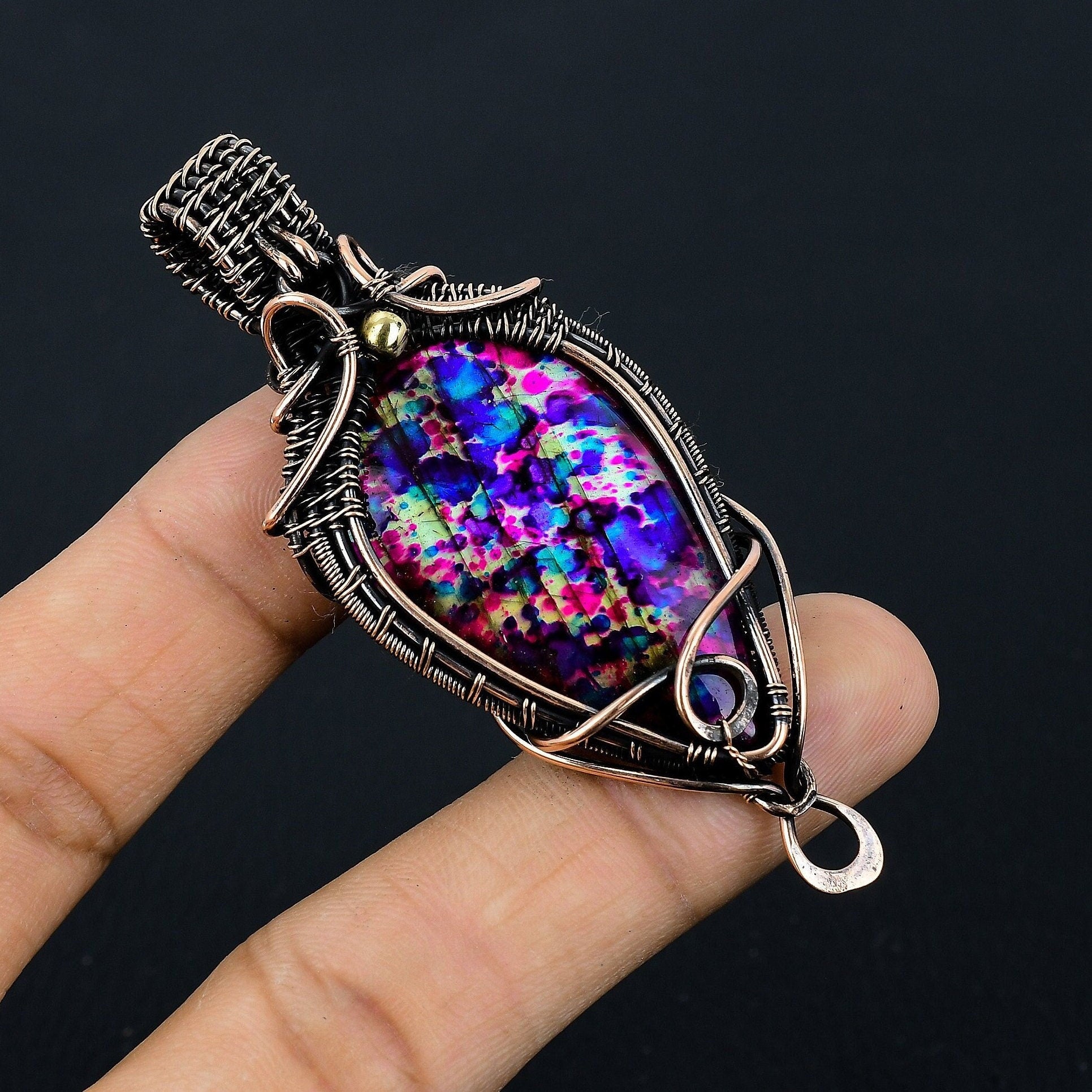 Embrace the allure of elegance with this stunning handcrafted pendant. Featuring a mesmerizing multicolored stone encased in intricately woven metal, this piece is a testament to artistic craftsmanship and unique design.