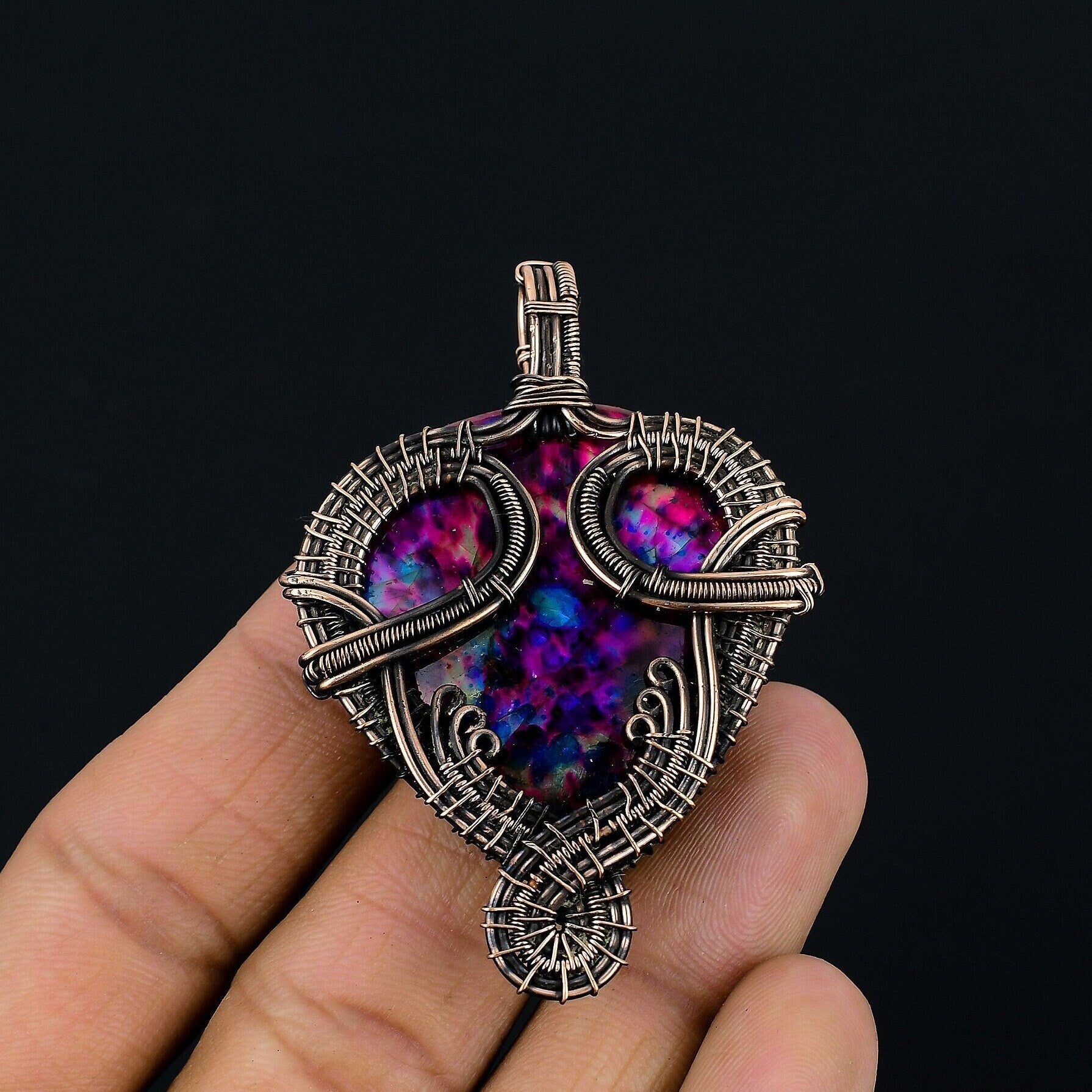 Discover the enchanting allure of our handcrafted wire-wrapped pendant, featuring a vibrant, iridescent gemstone that captures the essence of twilight.