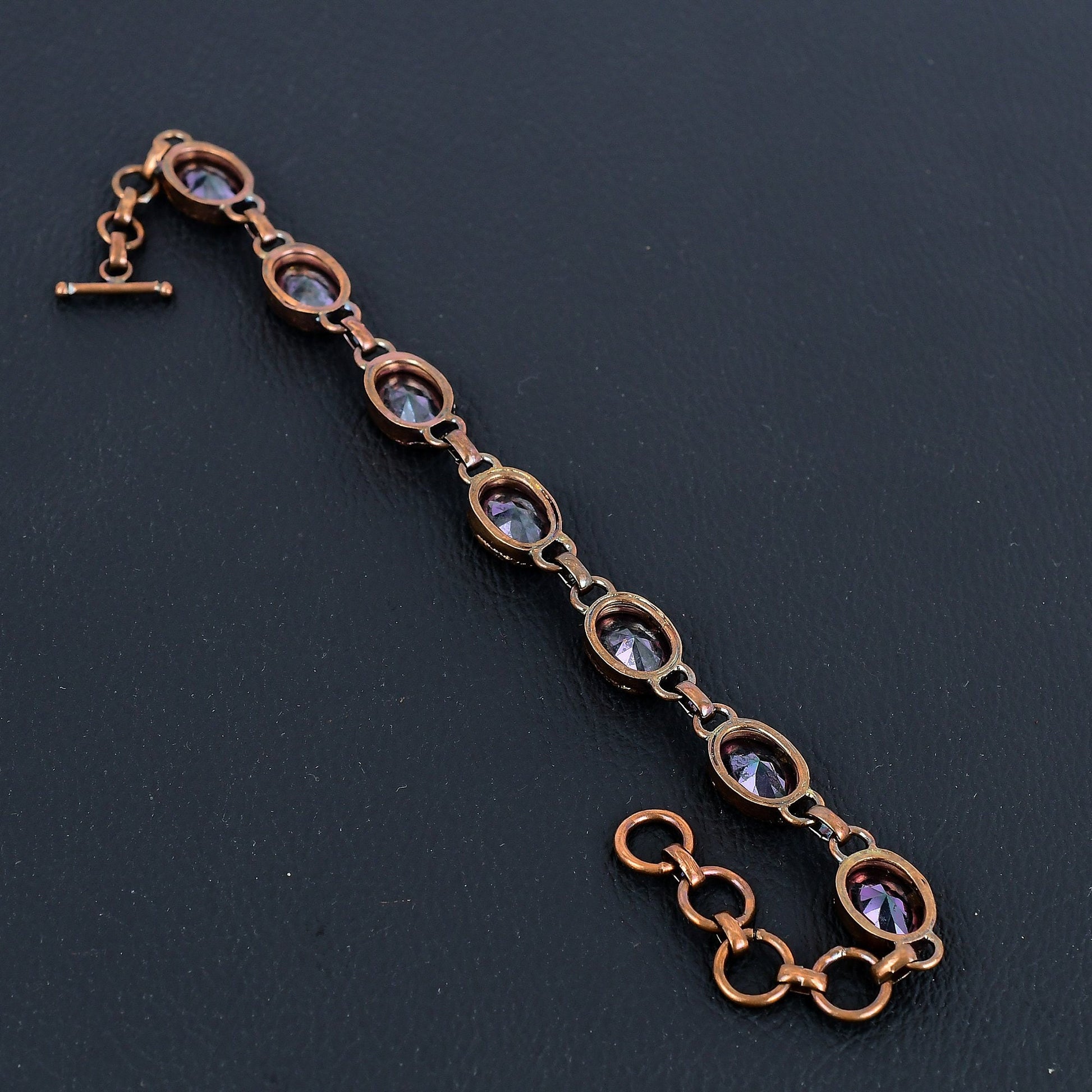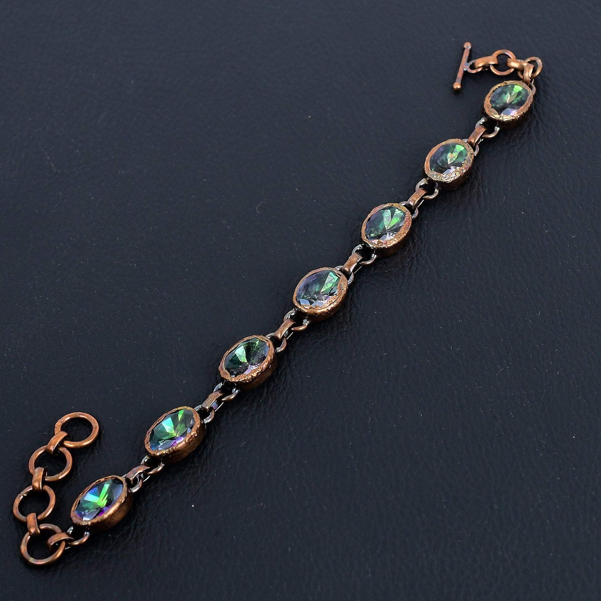 Elevate your style with this exquisite handcrafted bracelet, featuring a series of captivating iridescent gemstones set in a warm copper-toned chain.