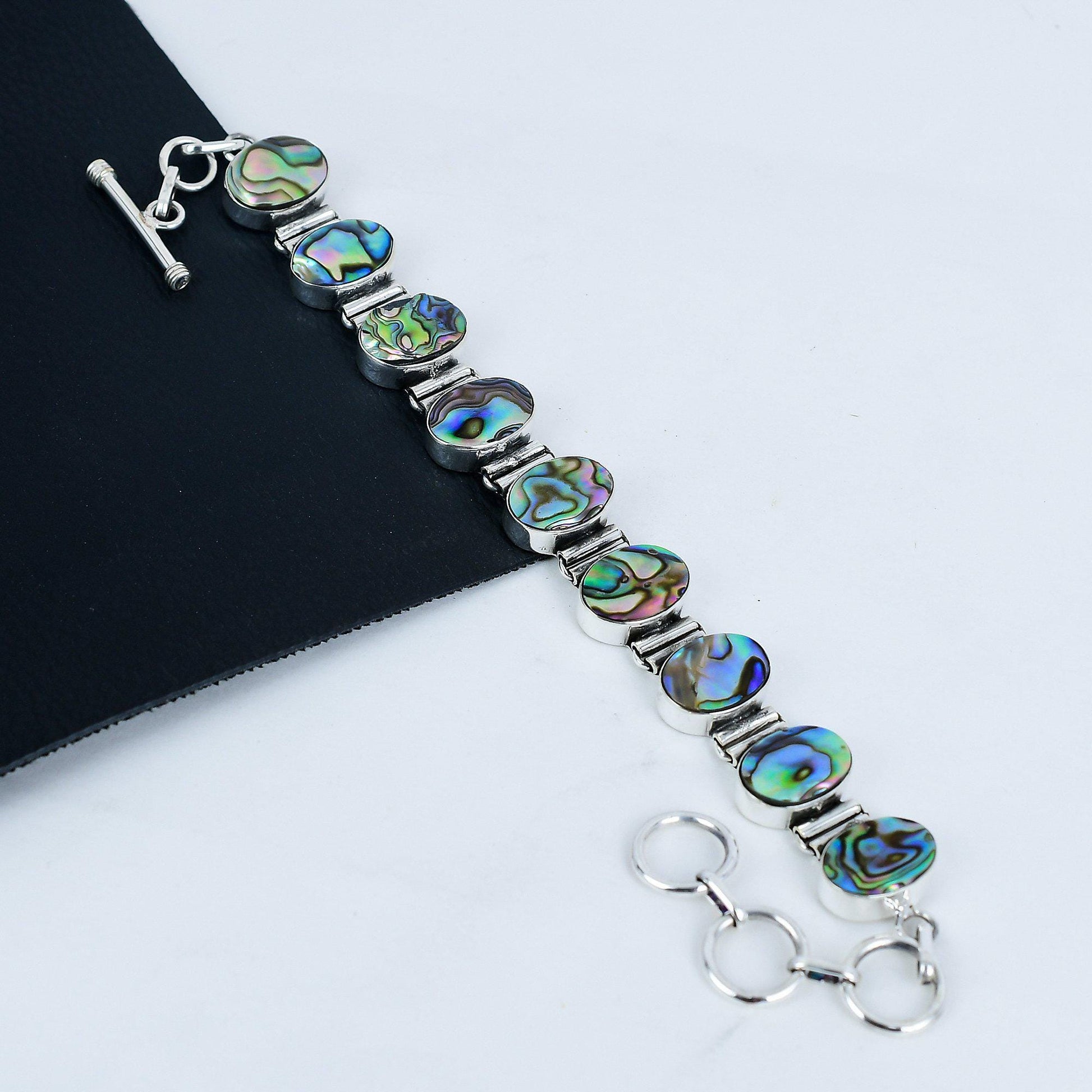 The bracelet features a series of stunning abalone shell stones, each showcasing a unique iridescent pattern. The natural beauty of the abalone shell offers a mesmerizing display of colors, ranging from deep blues and vibrant greens to warm purples and pinks.