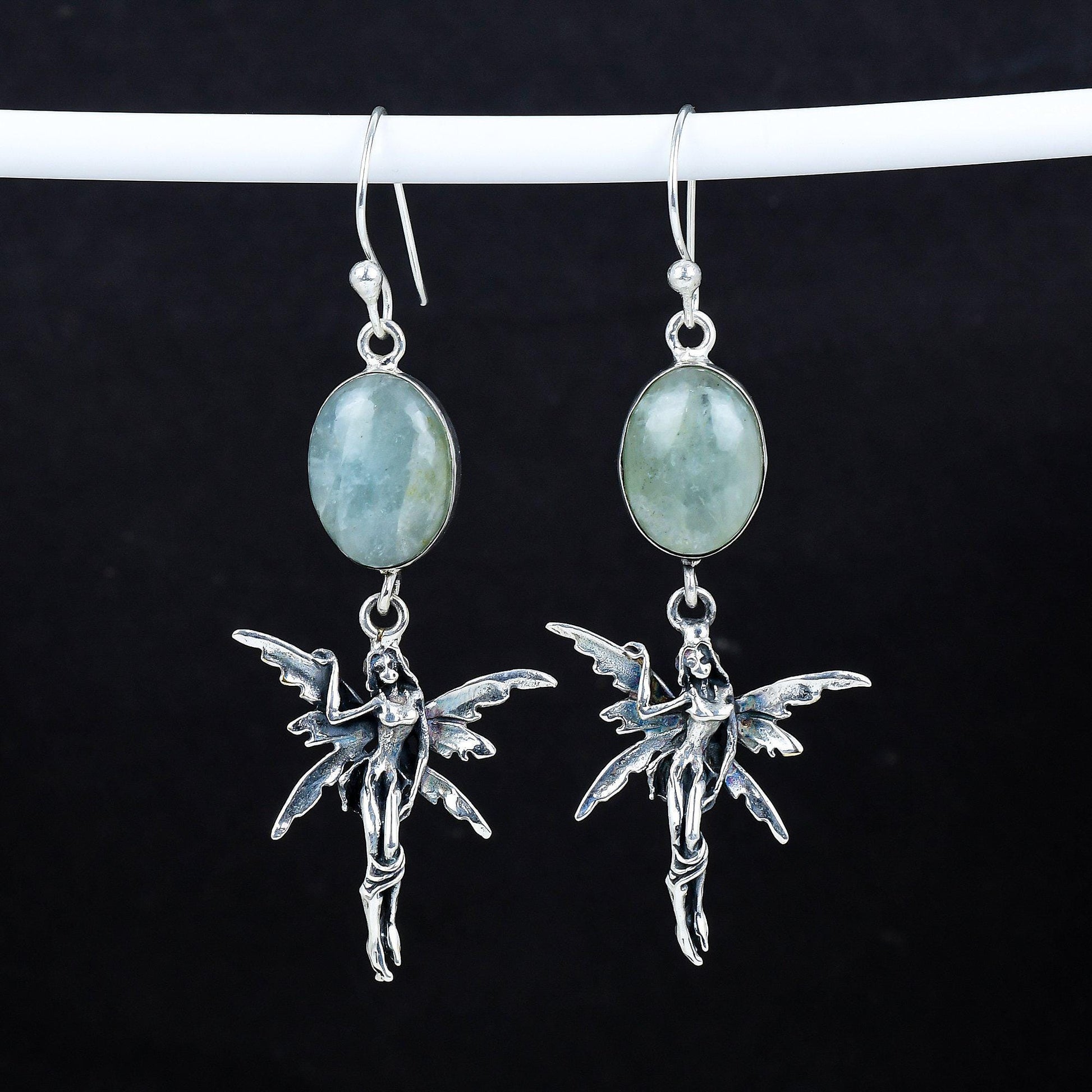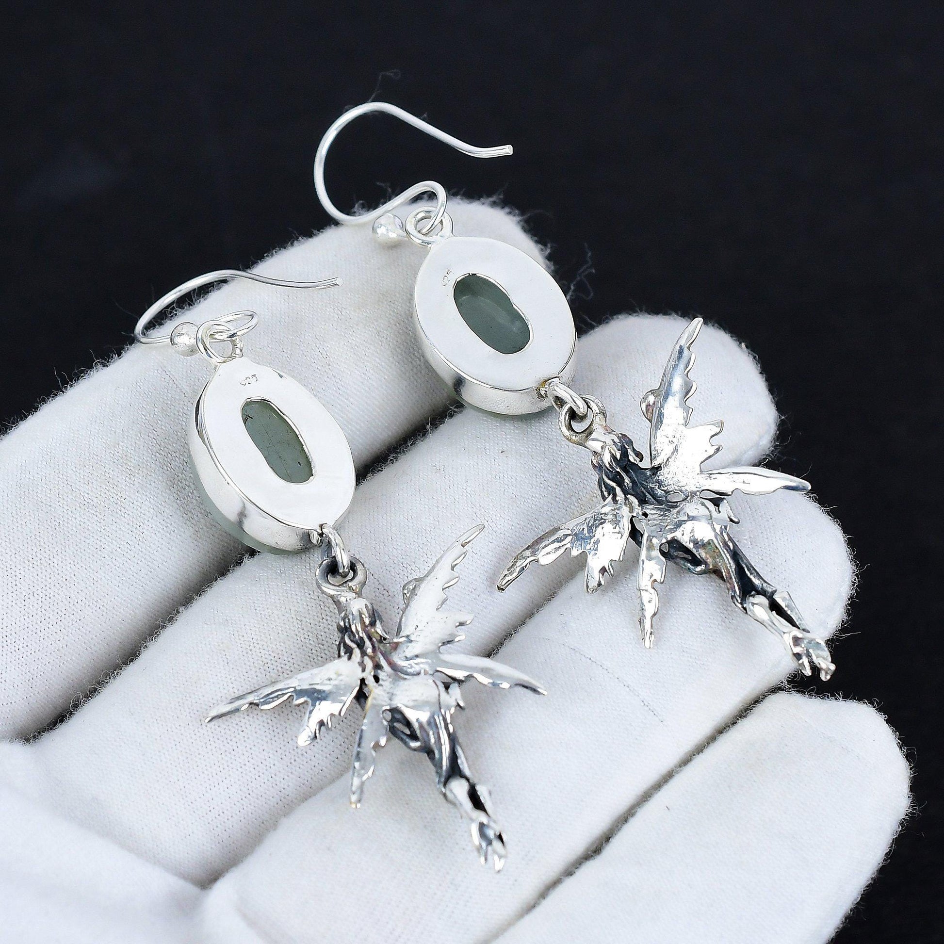 Design: Each earring features a beautifully sculpted fairy, capturing delicate details in sterling silver. Above the fairy, a polished, oval gemstone adds a touch of color and sophistication.