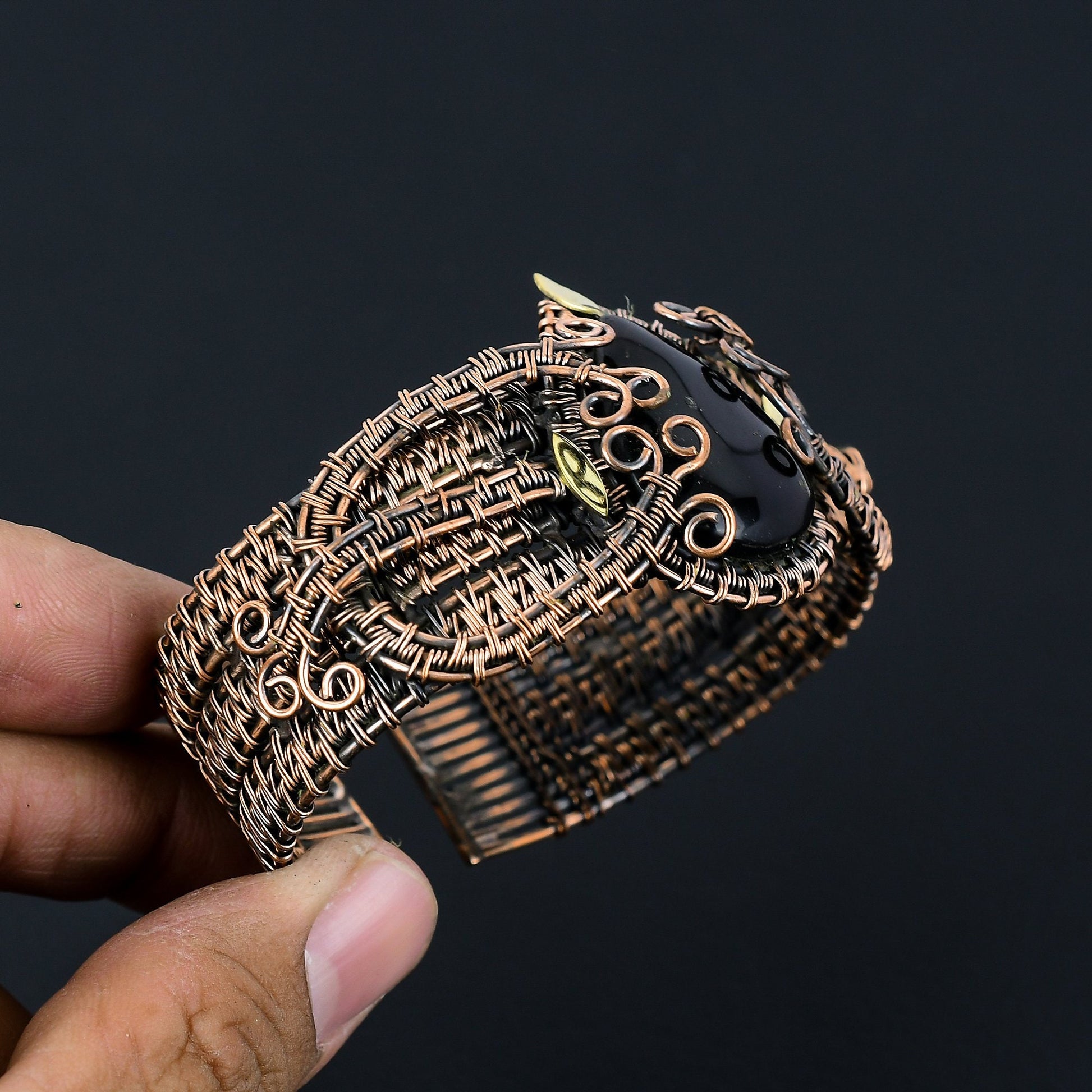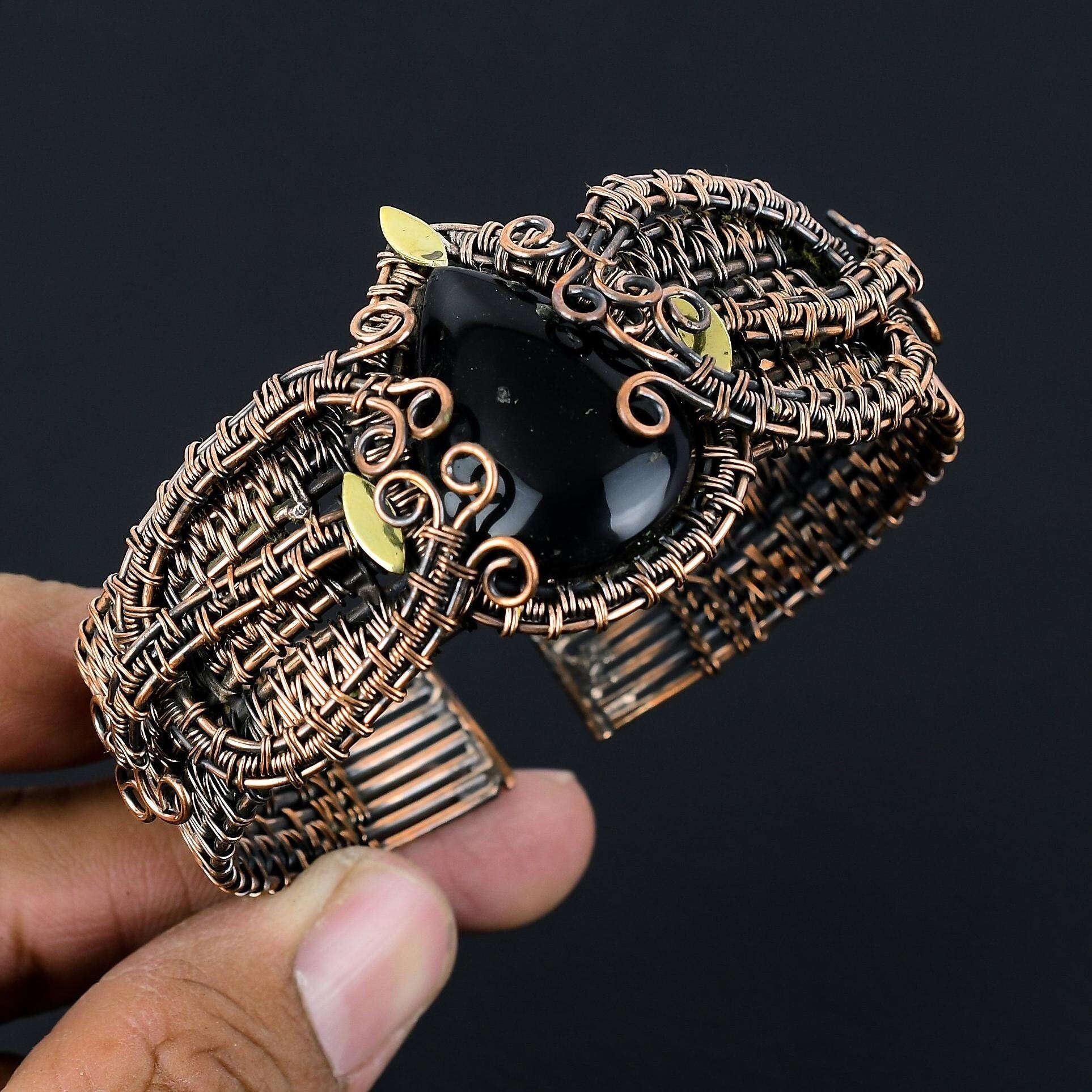 The rich copper tones beautifully complement the glossy black stone, creating a unique and eye-catching accessory.