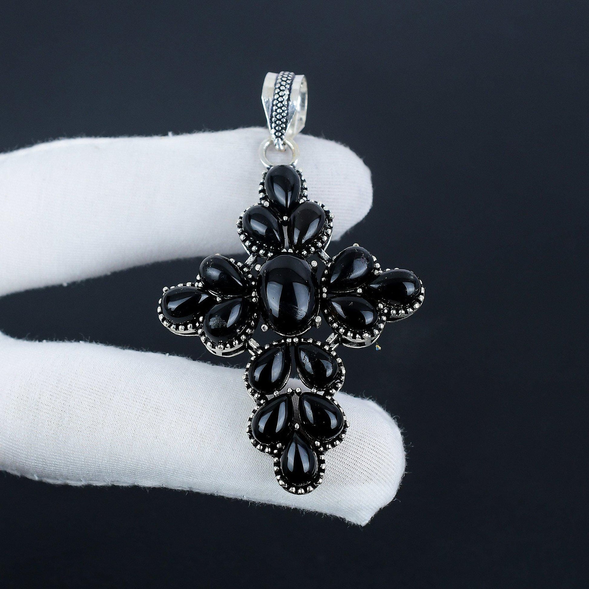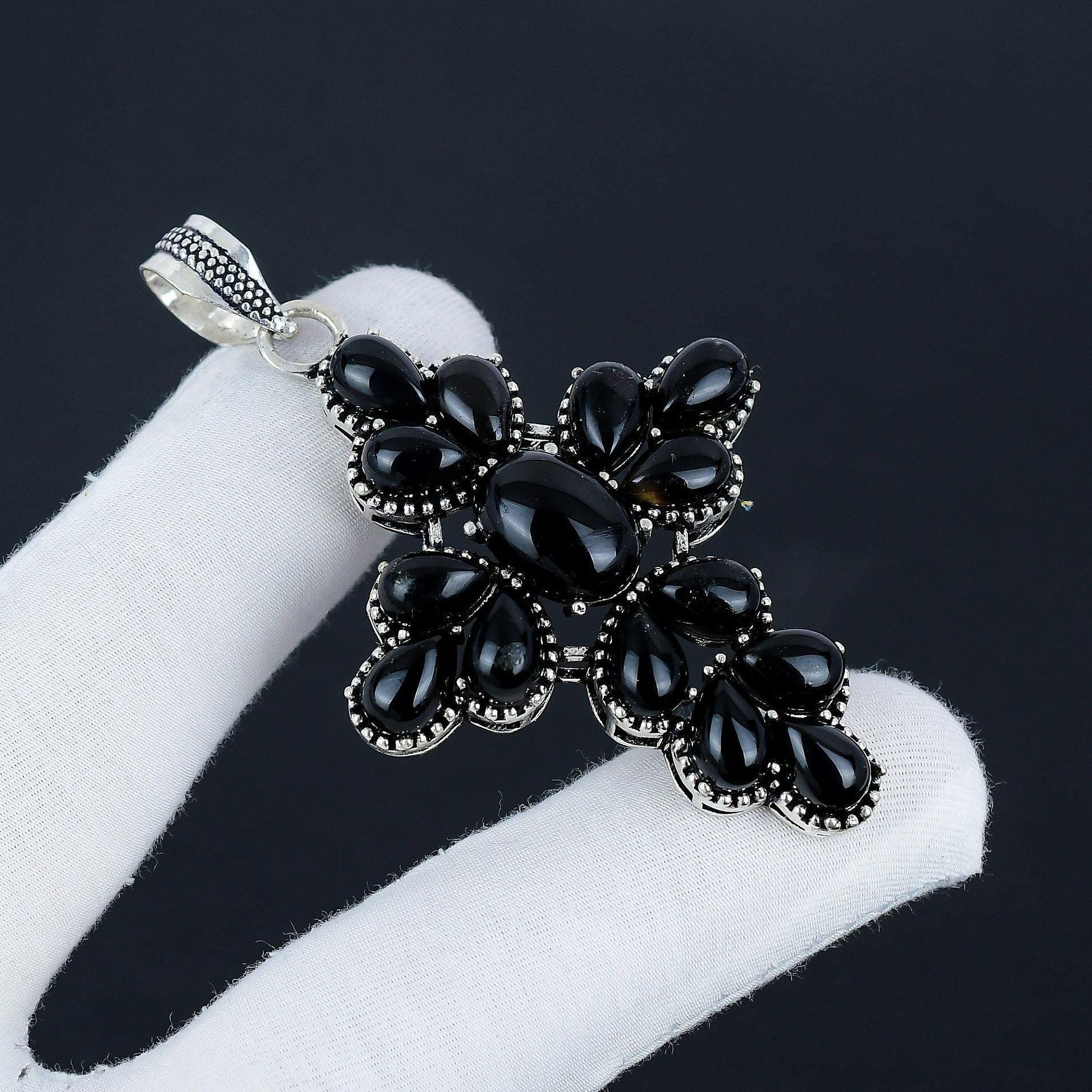 This exquisite pendant features intricately arranged black onyx stones, set in a captivating floral pattern. Each stone is expertly polished to enhance its natural gloss, adding a touch of luxury to any attire.