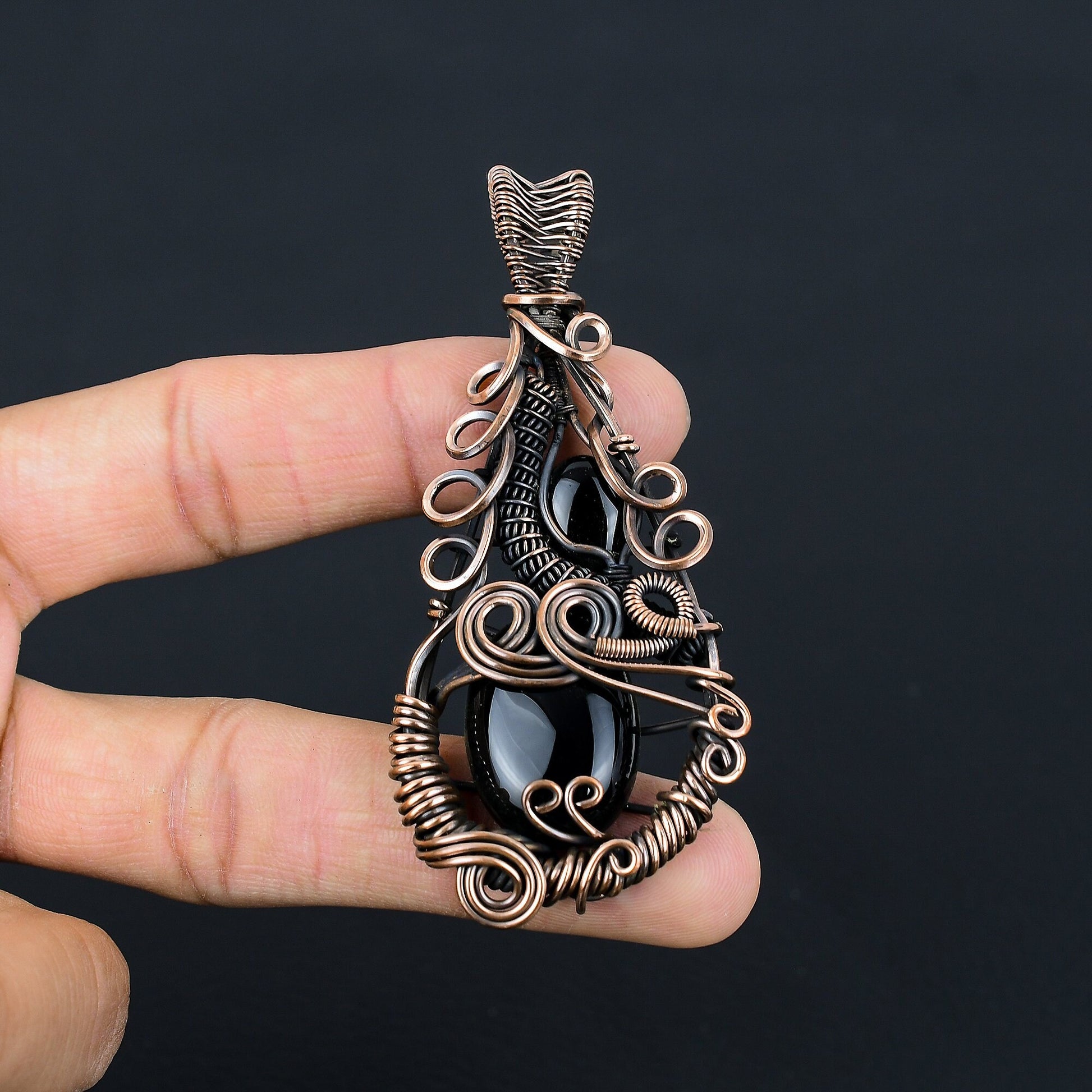 Featuring a beautifully polished black stone, this pendant is artfully crafted with intricate copper wire swirls and loops, highlighting its unique and exquisite design.
