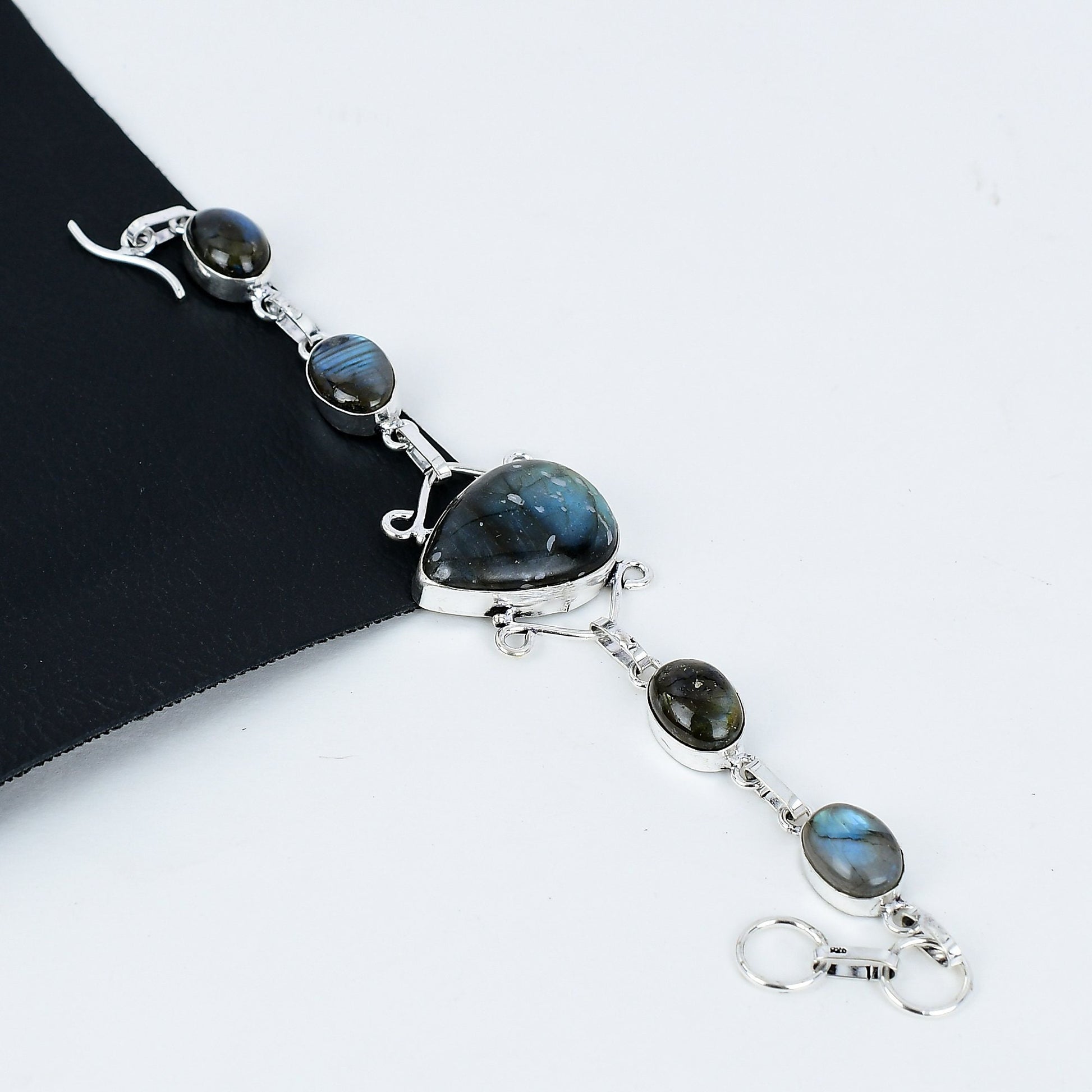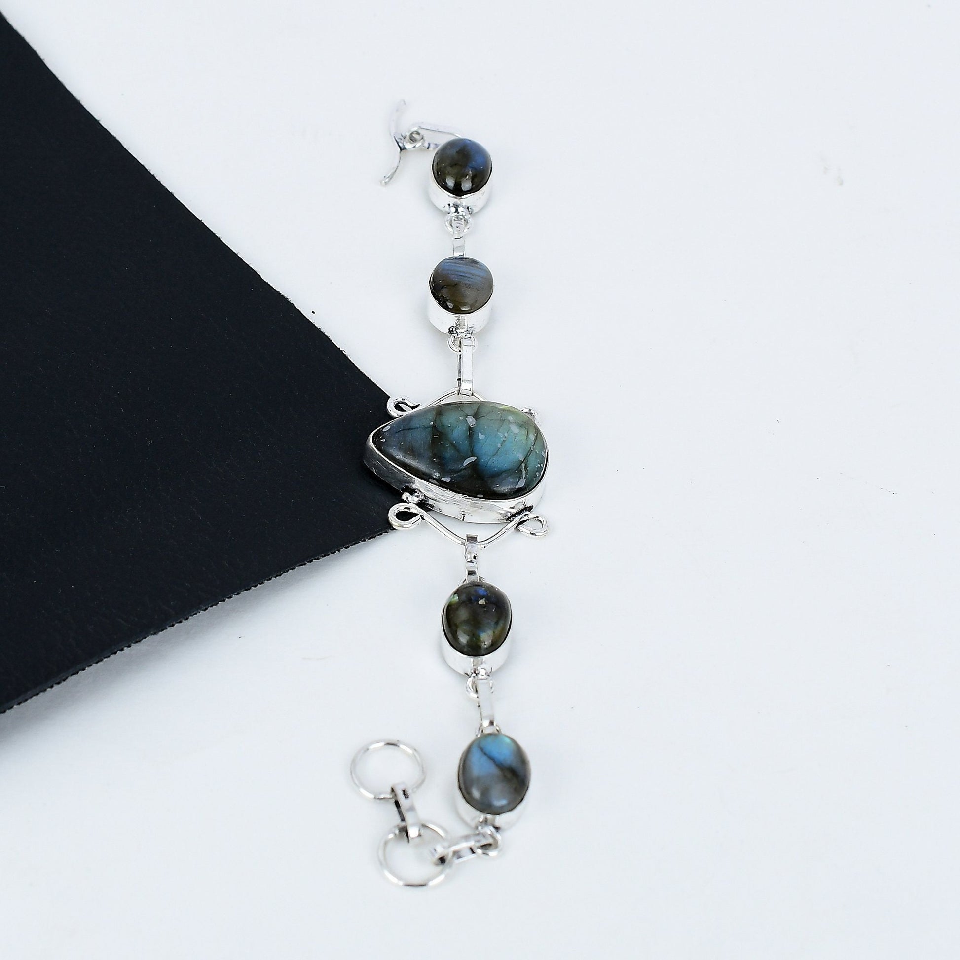Introducing our exquisite Labradorite Sterling Silver Bracelet, a stunning piece that captivates with its enchanting play of color. This bracelet features polished labradorite stones, known for their iridescent hues, which shimmer beautifully with every movement.