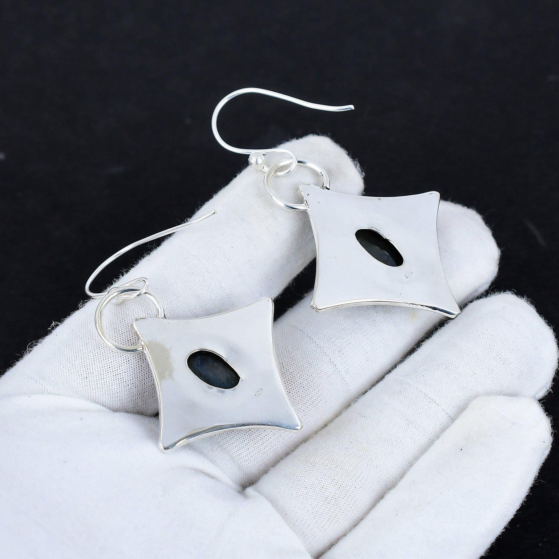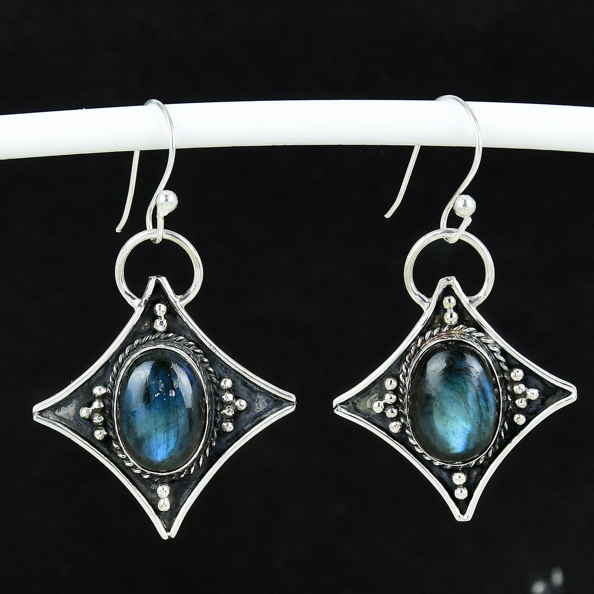 Each earring is adorned with a mesmerizing labradorite stone that shimmers in blue and green hues, making it a captivating focal point.