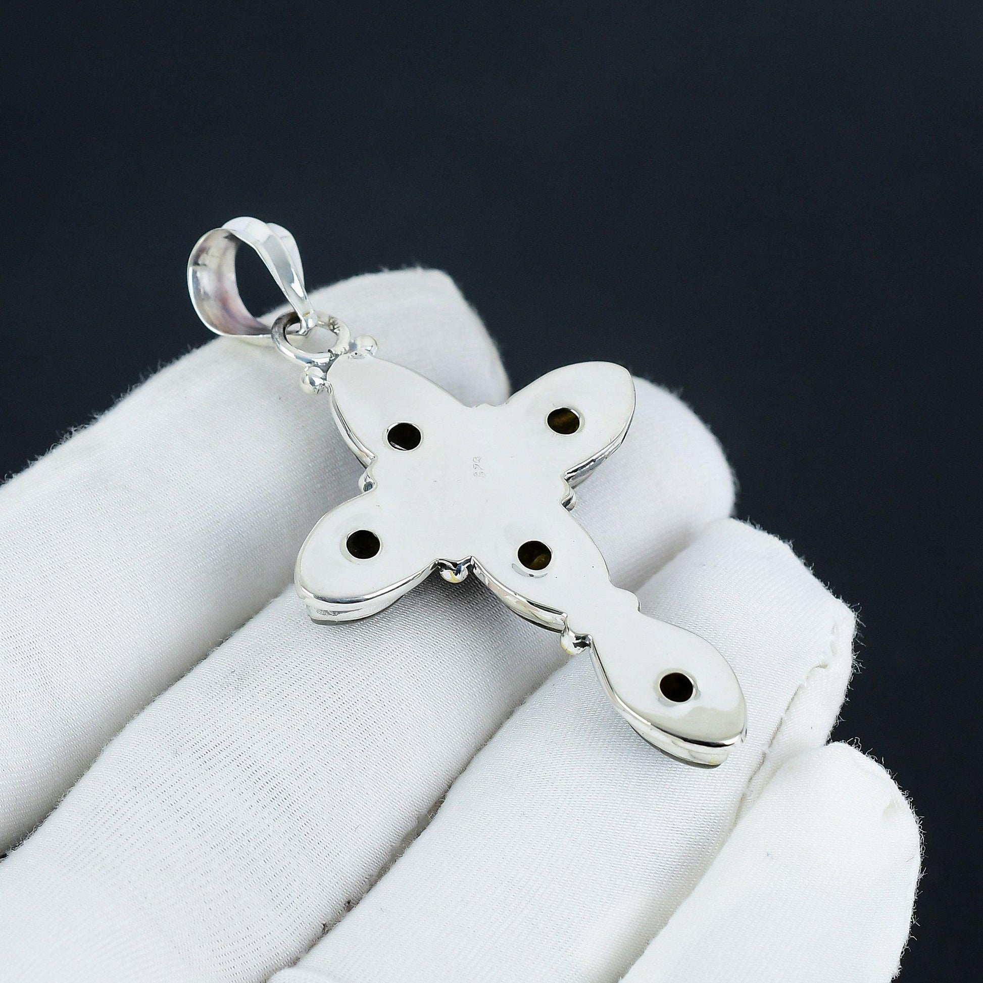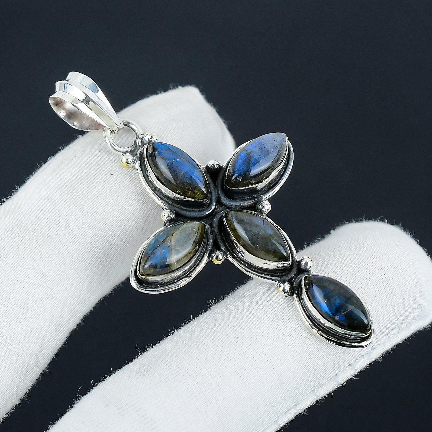 Elevate your style with this exquisite Labradorite Cross Pendant, a perfect fusion of elegance and mystique. Crafted with precision, each petal-shaped labradorite stone showcases a unique play of blues and greens, catching the light with every movement.